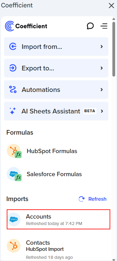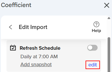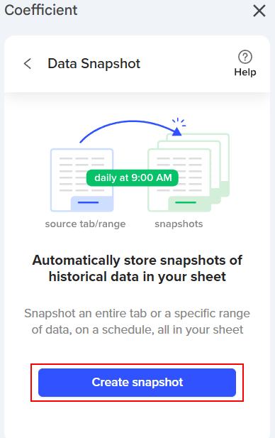 You can set up a Snapshot in Coefficient using two methods: through the sidebar or from a new or existing import. Let’s explore each option below.