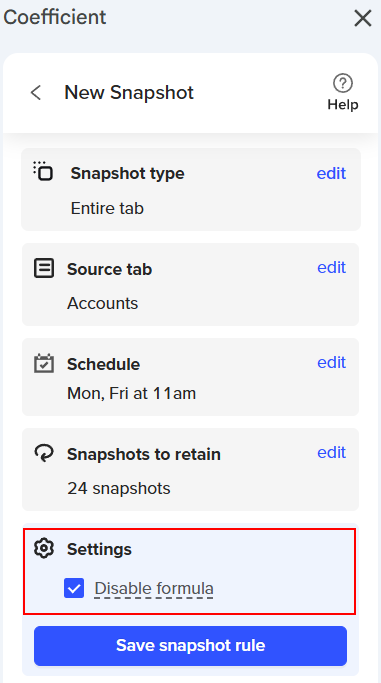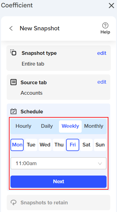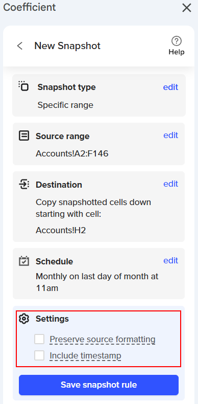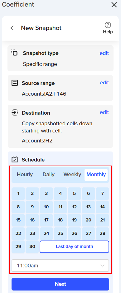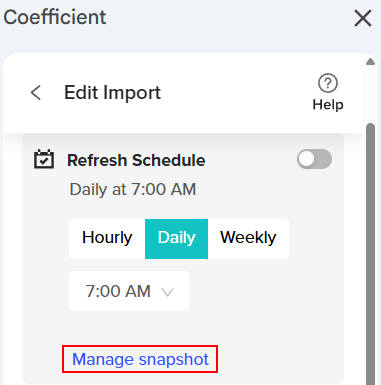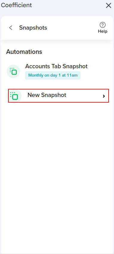 Coefficient Snapshots simplify capturing a copy of your data by creating a new tab, placing it in a designated area of your spreadsheet, and scheduling it to update automatically weekly or monthly. Snapshots preserve your data at a specific time while the original data import continues to refresh, ensuring your insights stay current. This feature is handy for maintaining historical data to enrich your reports and dashboards.