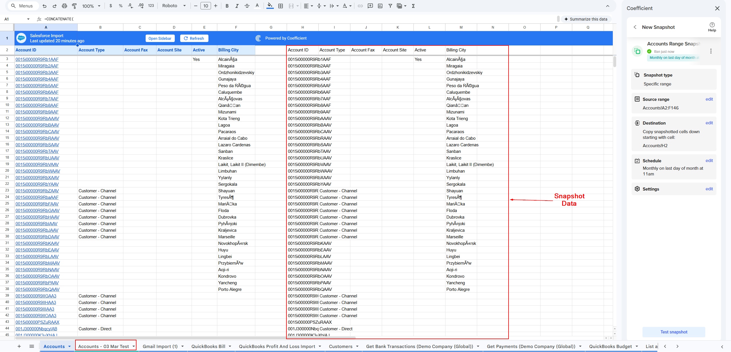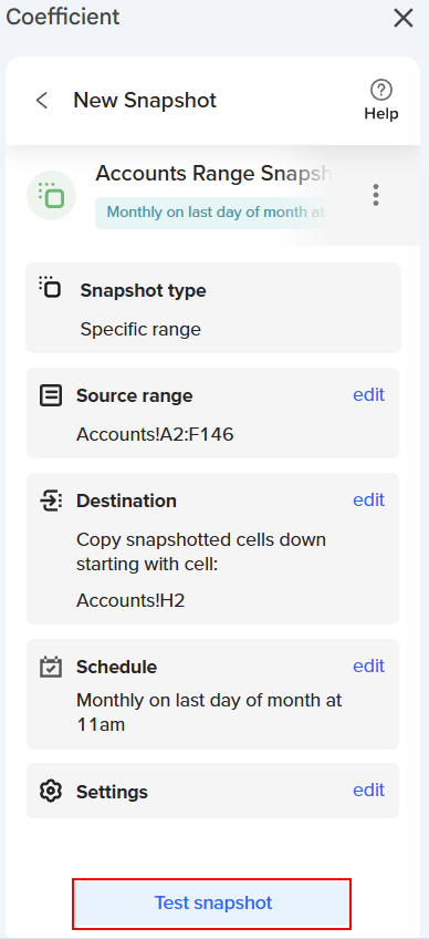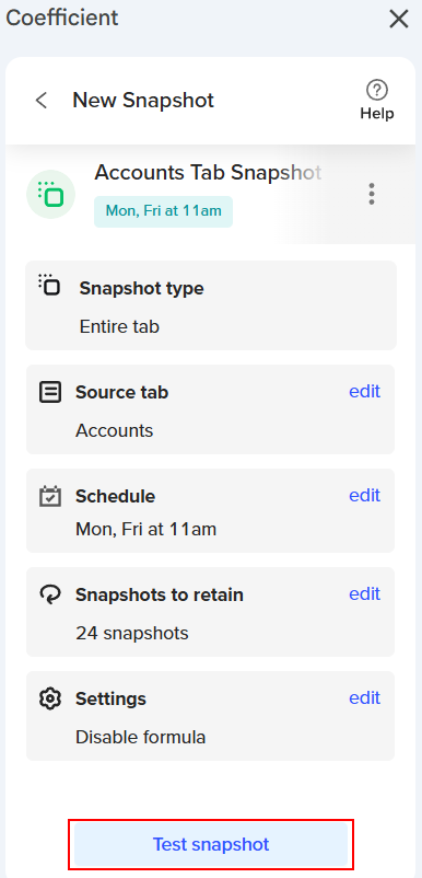 | 9. Coefficient lets you test your Snapshot to ensure all settings are configured correctly. When you click "Test Snapshot," Coefficient will simulate the creation of the Snapshot by adding a new tab to your sheet. |