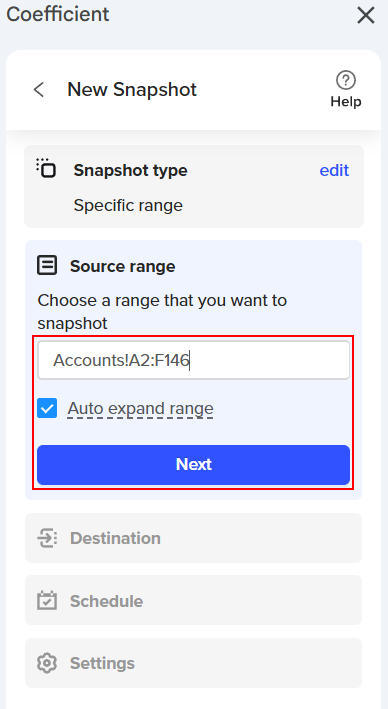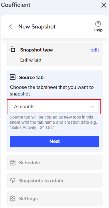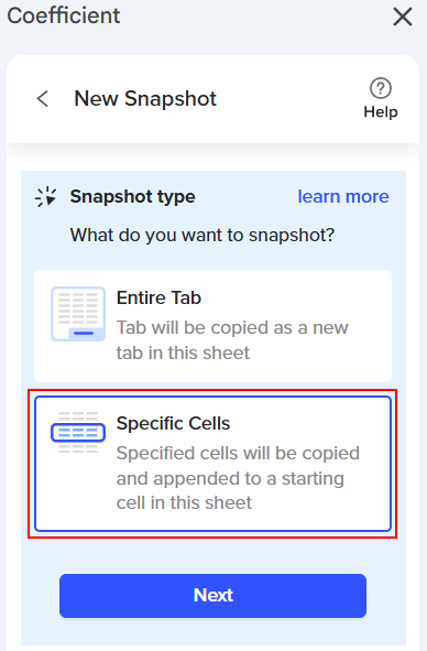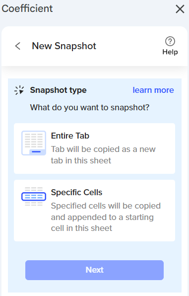 Coefficient offers two Snapshot options: "Entire Tab" and "Specific Cells." Your choice will depend on your goals and the specific data you want to capture in your sheet. Let’s explore each option in detail!