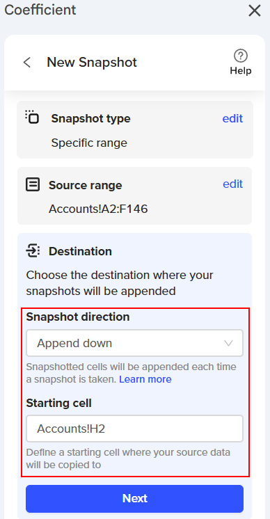 6. Destination: Starting Cell - This is the location where your snapshot data will be copied. Snapshot Direction - Specifies how your snapshotted data will be displayed from the starting cell (Append Down, Append to the Right, or Replace Range). |