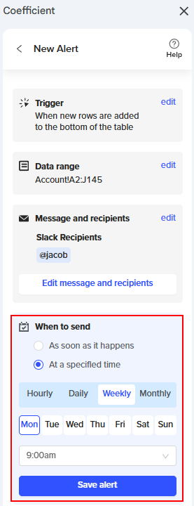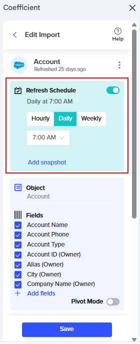 With Coefficient, you can schedule your imports to ensure your data is refreshed from the source at designated times and dates.