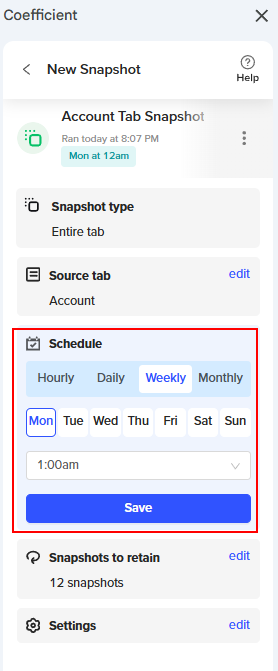 What does that mean? If a user sets a Snapshot to generate “Weekly” and “on Monday” at "1 am", AND the user’s computer is set to Pacific Time, THEN Coefficient will create a new Snapshot of the user’s import on Monday morning 1 AM Pacific Time. |