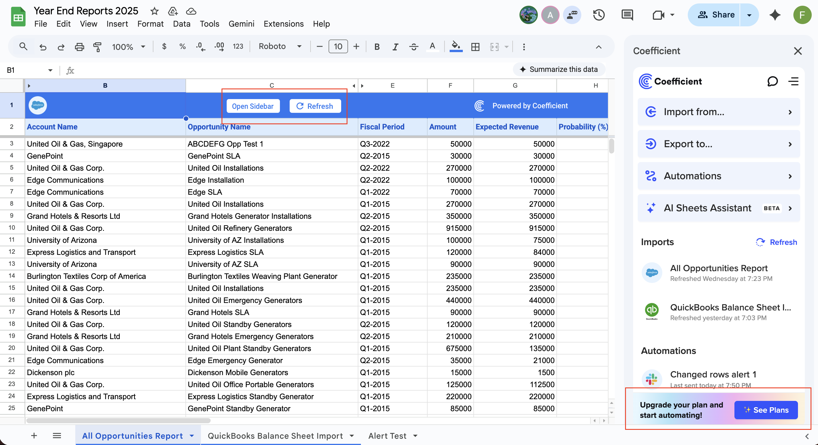 2. The user/Freddy should be able to access the shared sheet, but the licensed features are now restricted. The on-sheet buttons (Open Sidebar, Refresh, and Export to…) are still available for Freddy to use. (For more information about the Coefficient Free Plan, click here.)