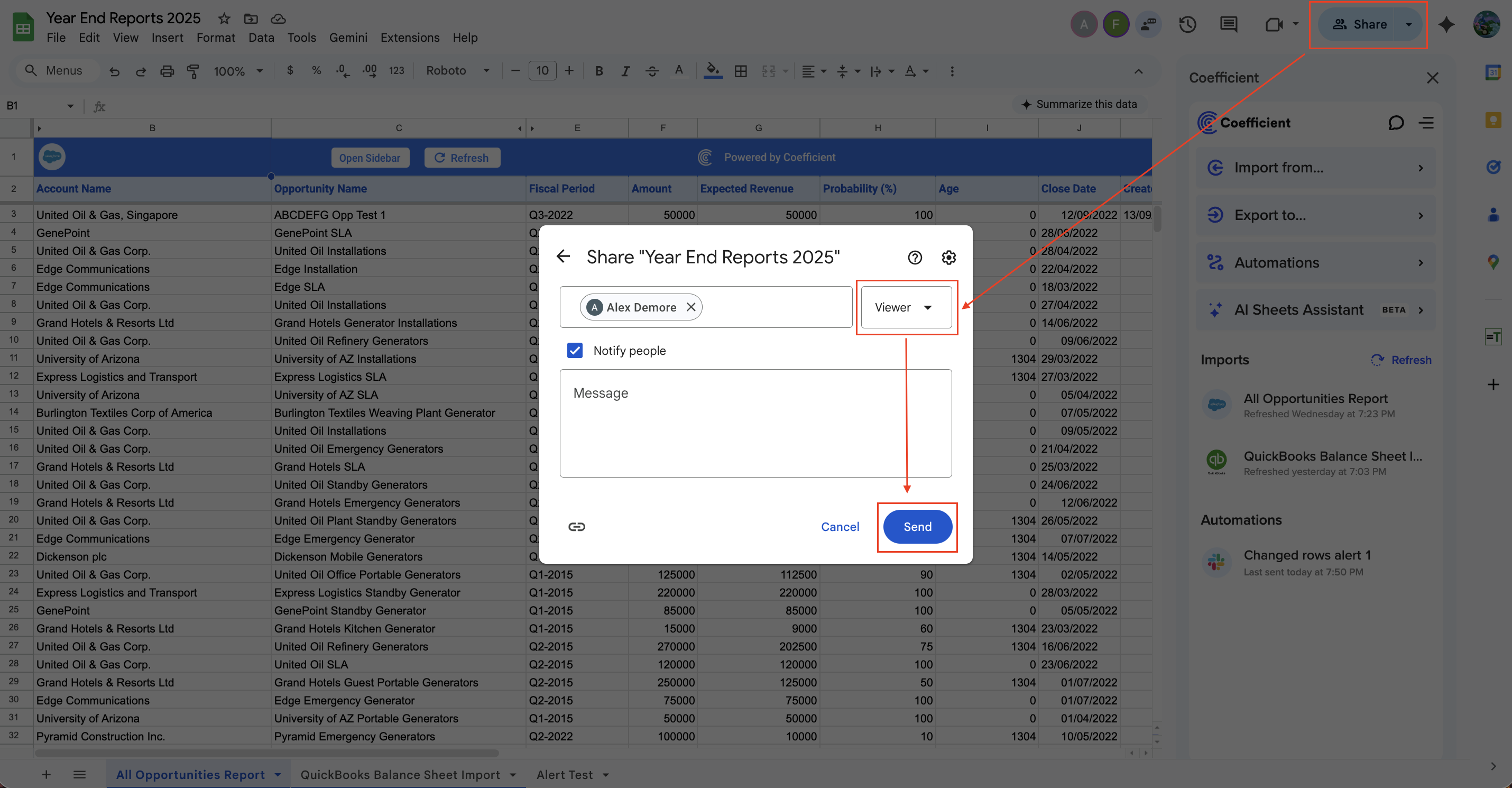 Scenario 3: A Coefficient licensed user (Alex Demore) (within your domain) is given Viewer/Commenter access to your spreadsheet/workbook.