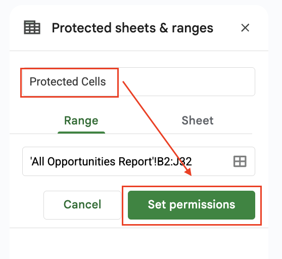 2. Enter a description and select the cell range/sheet as needed, “Set Permissions”. |