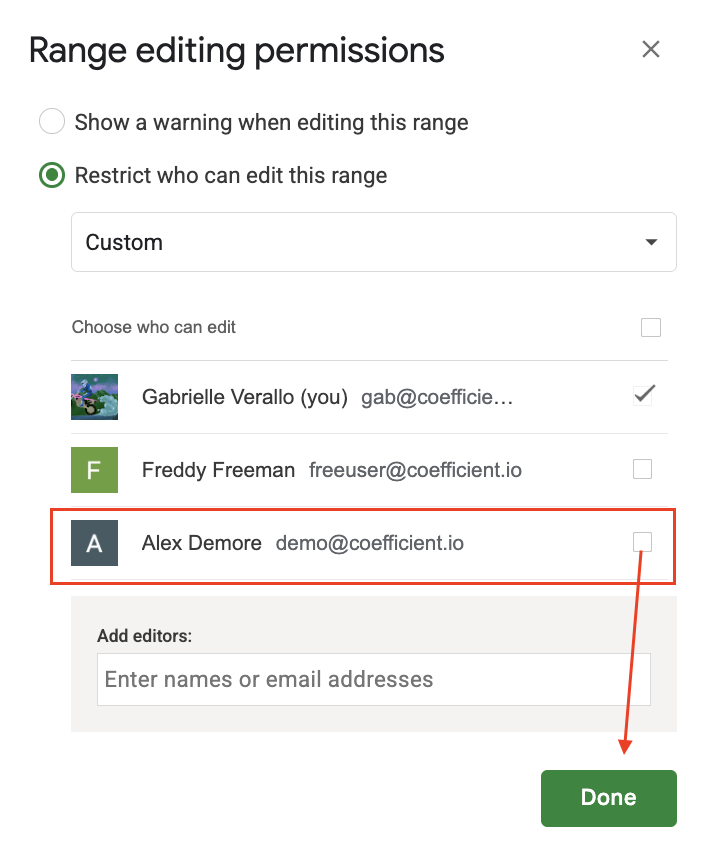 3. Designate the permissions (Uncheck Alex Demore from having edit access to the range) then click Done. |