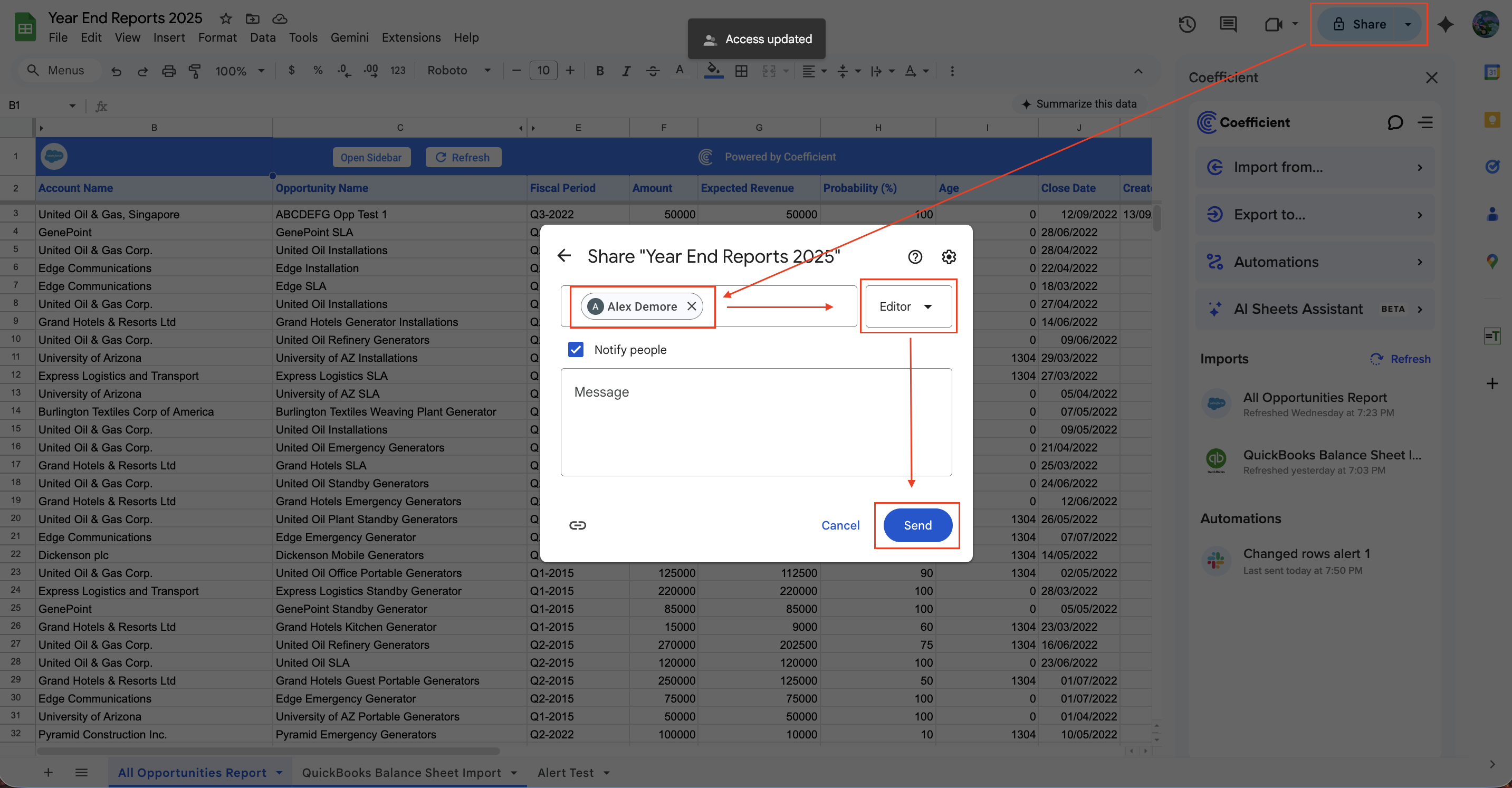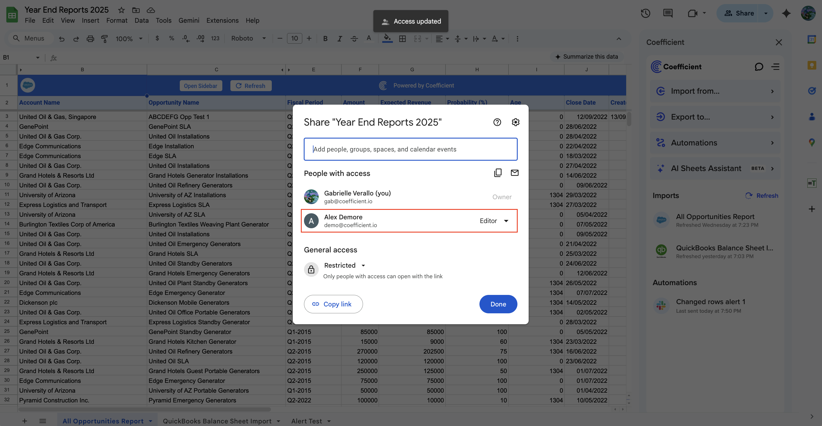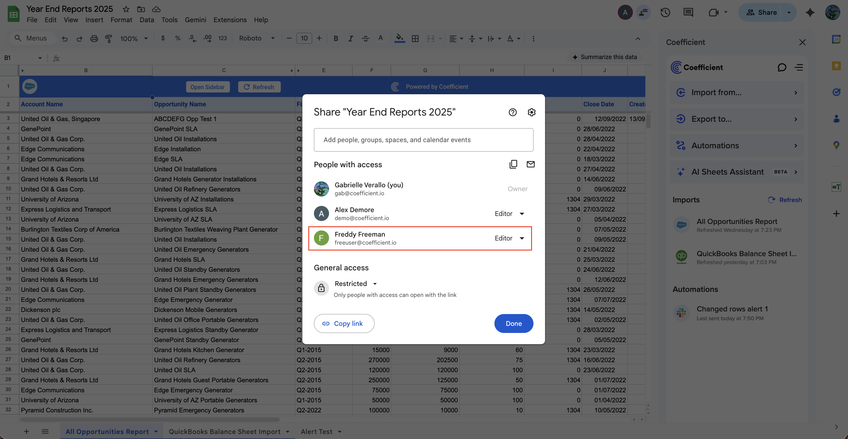 Scenario 1: A Coefficient licensed user (Alex Demore) (within your domain) is given Editor access to your spreadsheet/workbook.