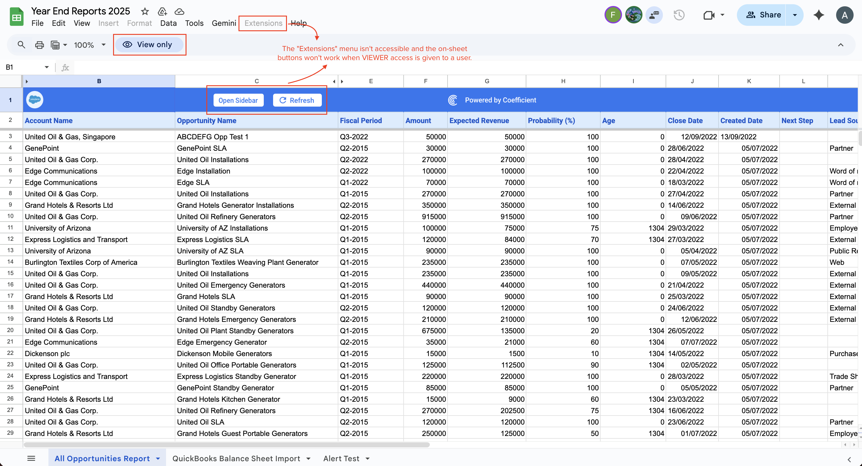 2. This user (Alex) will not be able to interact with any Coefficient functions within your Sheet, including launching Coefficient from the Extensions menu (it will be greyed out). The user (Alex) will also be blocked from making any changes to imports or data within the sheet. (If the user is granted Commenter access they can make comments on a cell, Viewers may not)