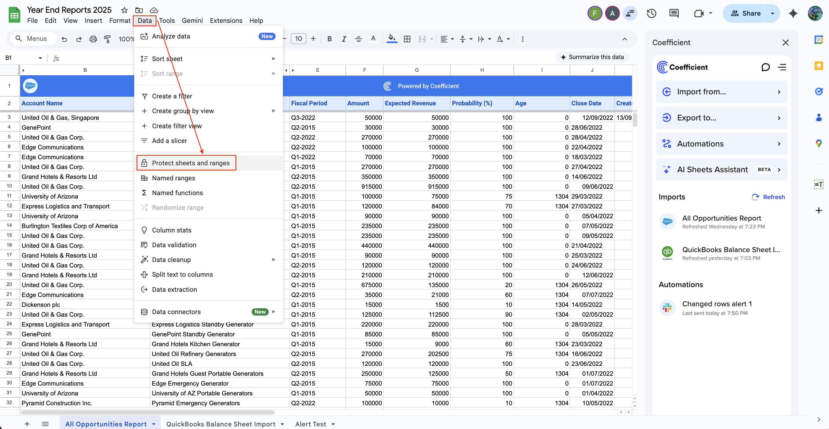 1. To add a Protected Range on a Coefficient import, click on the Data tab in Google Sheets, and select “Protected sheets and ranges”. Then “Add a sheet or range”.