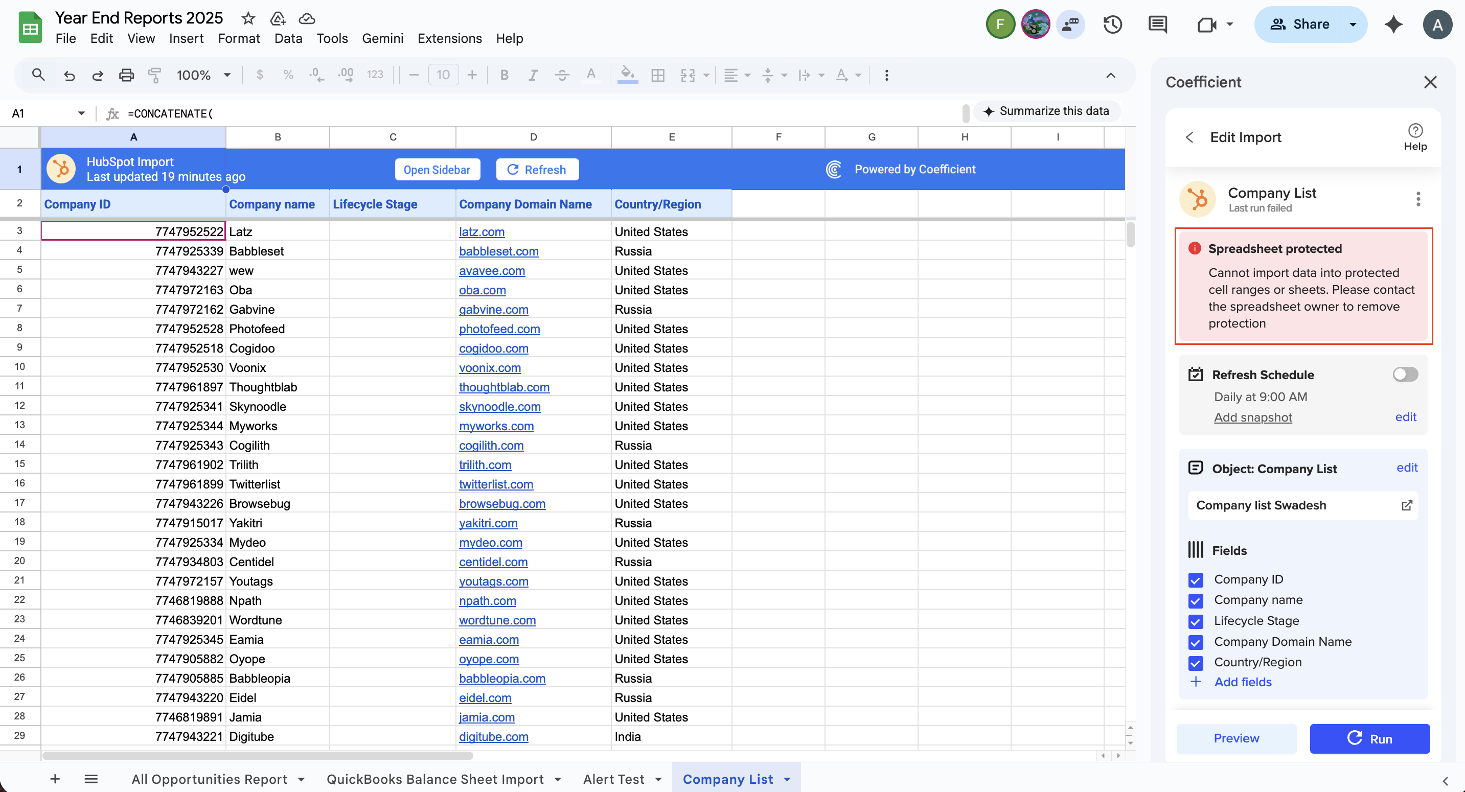4. The user (Alex) should still be able to utilize the on-sheet buttons and launch Coefficient from the Extensions menu, but they should get an error if they try to edit/refresh an import with the protected range settings enabled