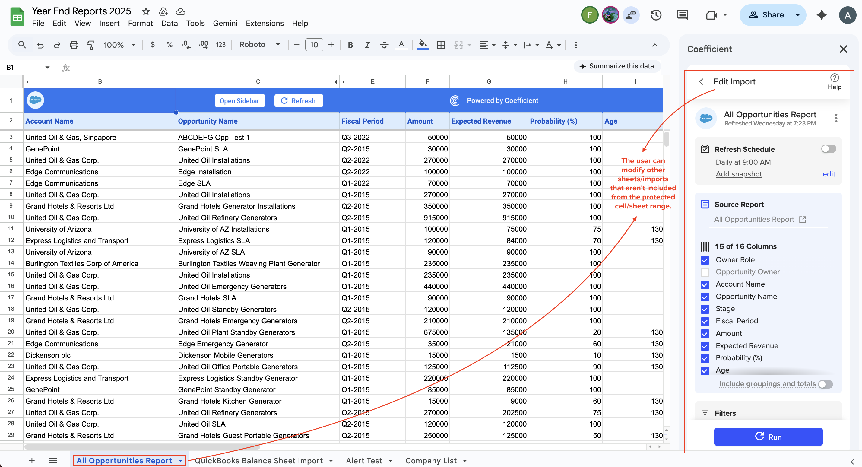 Scenario 4: A Coefficient licensed user (Alex Demore) (within your domain) is given Editor access to your spreadsheet/workbook but added a Protected Range to an import.