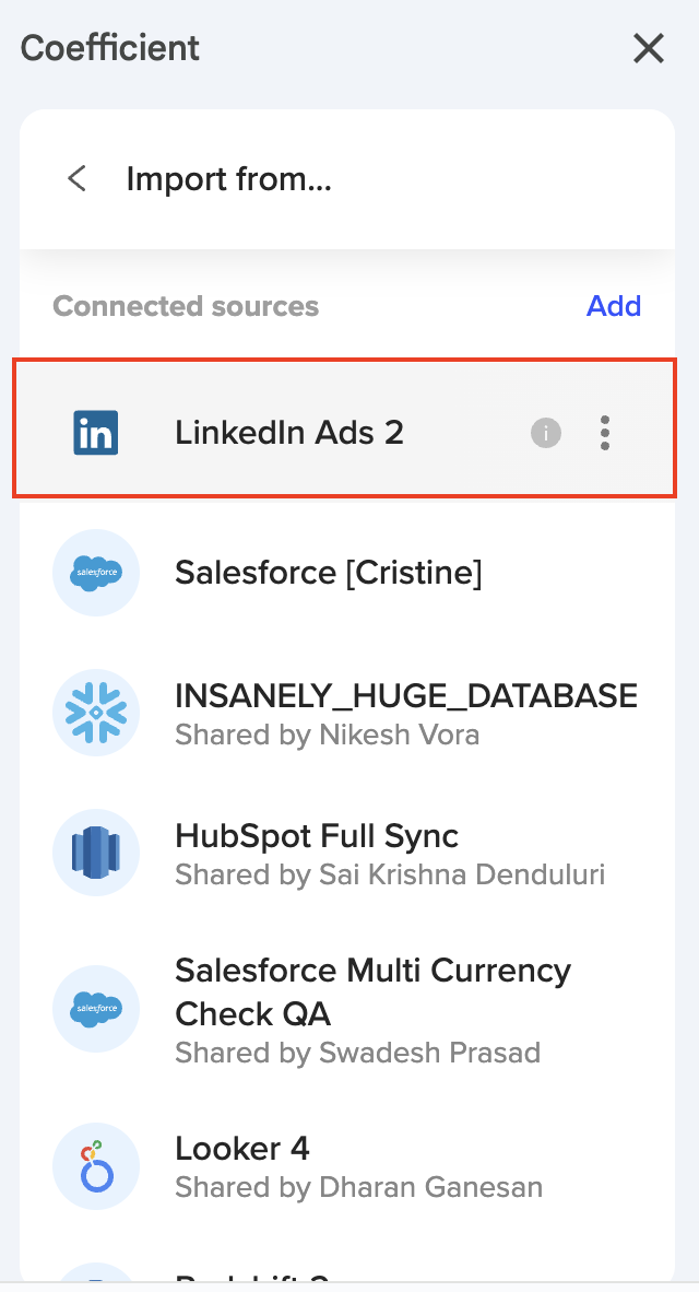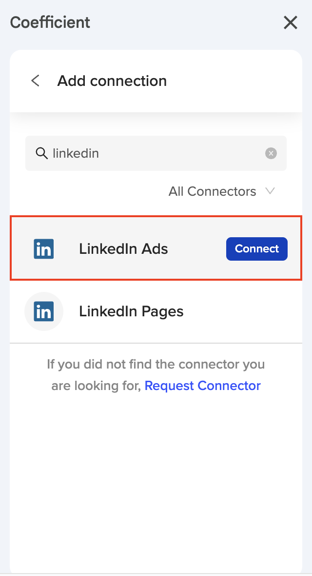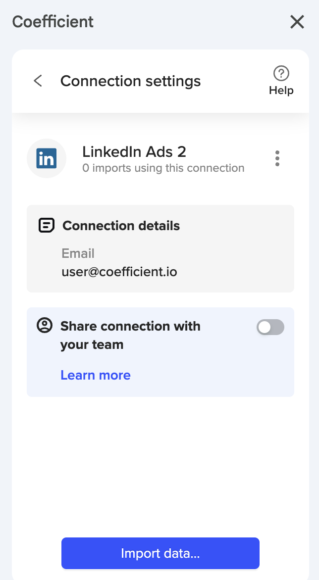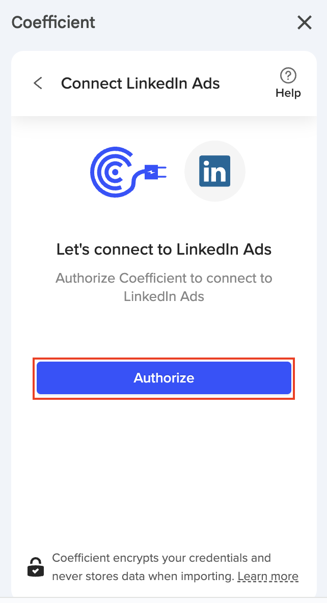 When you begin a LinkedIn Ads import for the first time, you will need to go through a few steps to connect your account to Coefficient before you’re able to import data from LinkedIn Ads to Google Sheets/Excel using Coefficient.
