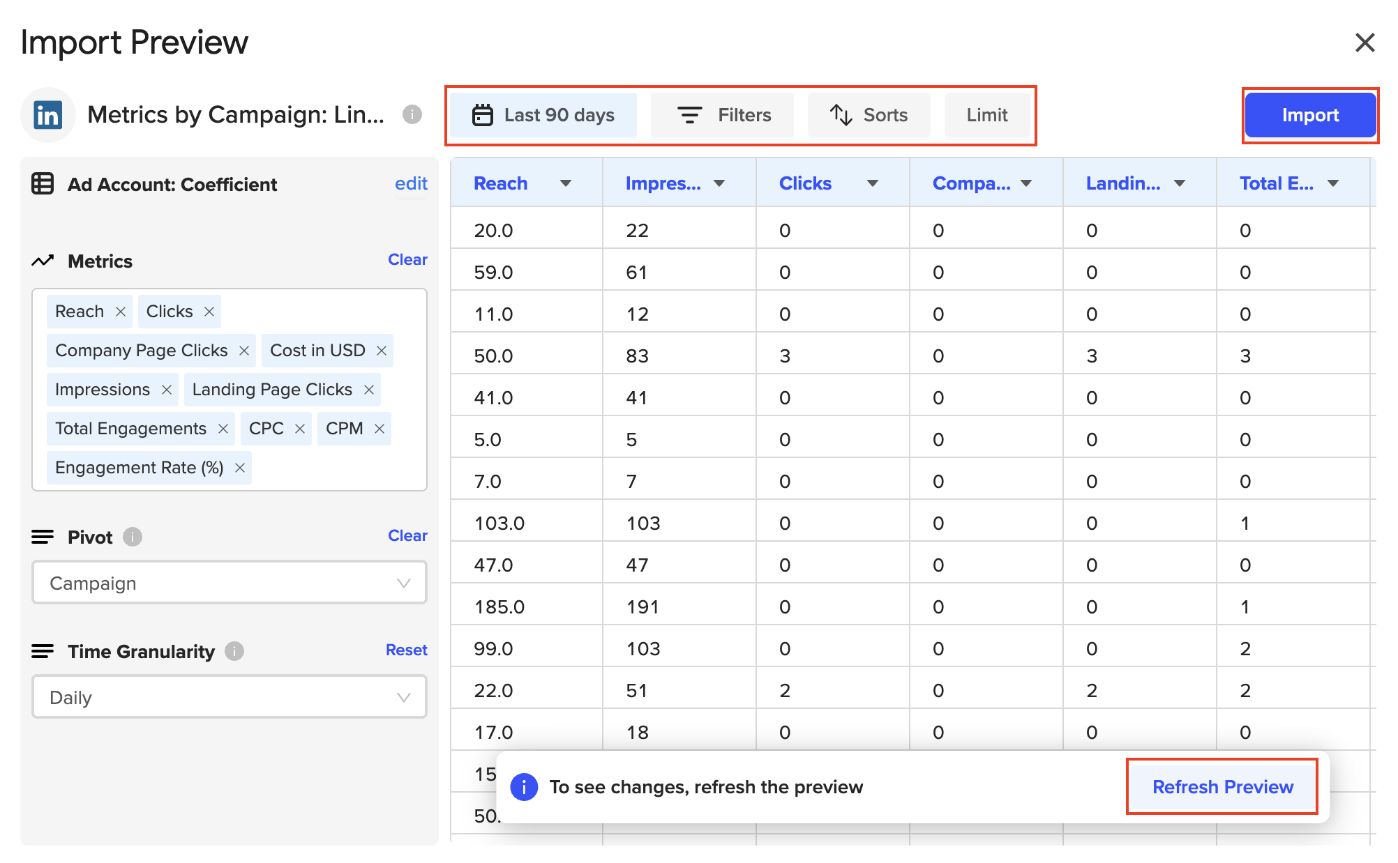 Due to LinkedIn Ads API limitations, sorting is limited in Coefficient imports. When a time-granularity parameter is specified during import, the results are sorted by default. You can, however, override this by sorting through the following metrics if selected: