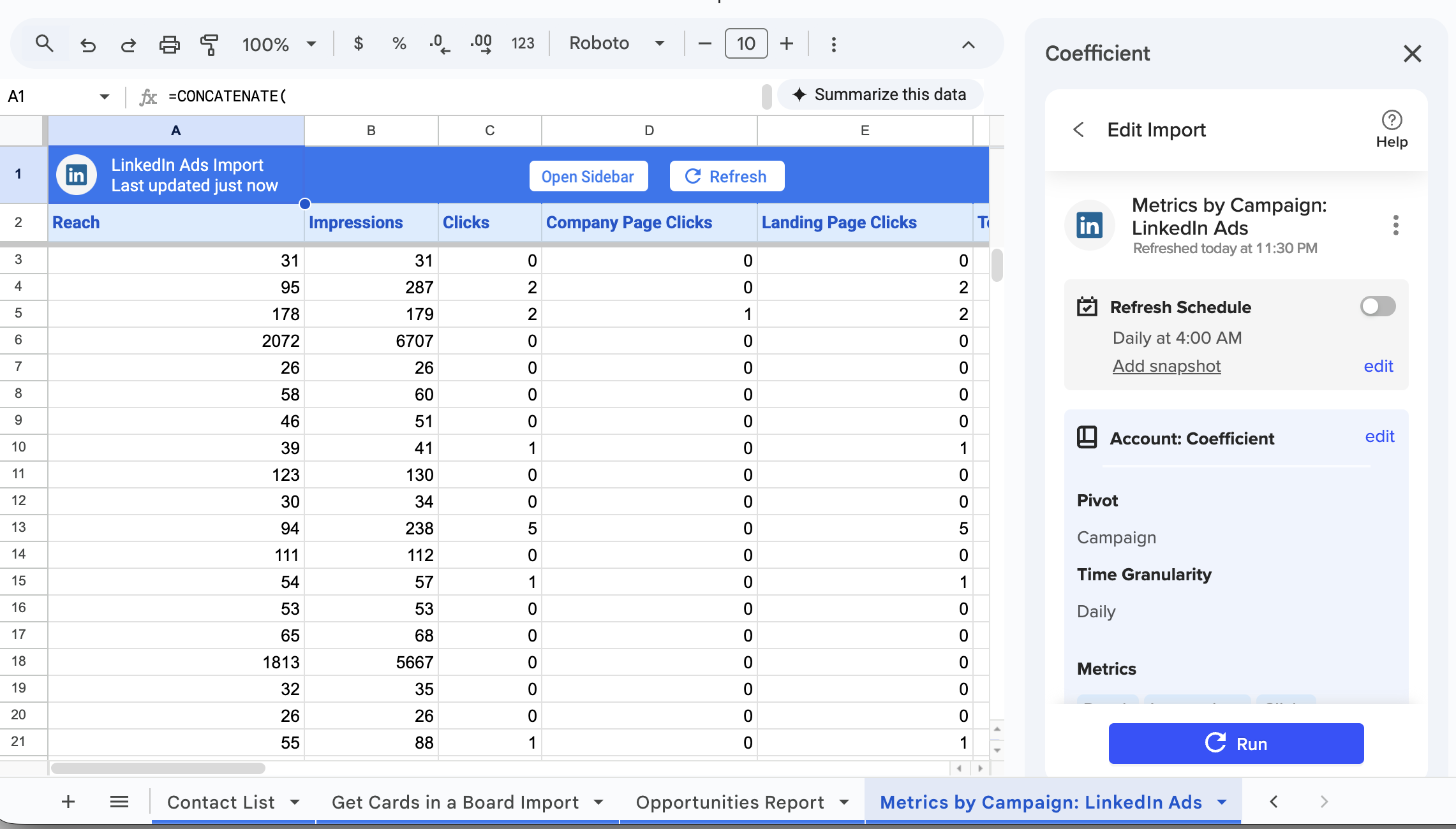 6. Congratulations on your first LinkedIn Ads import with Coefficient! 🎉