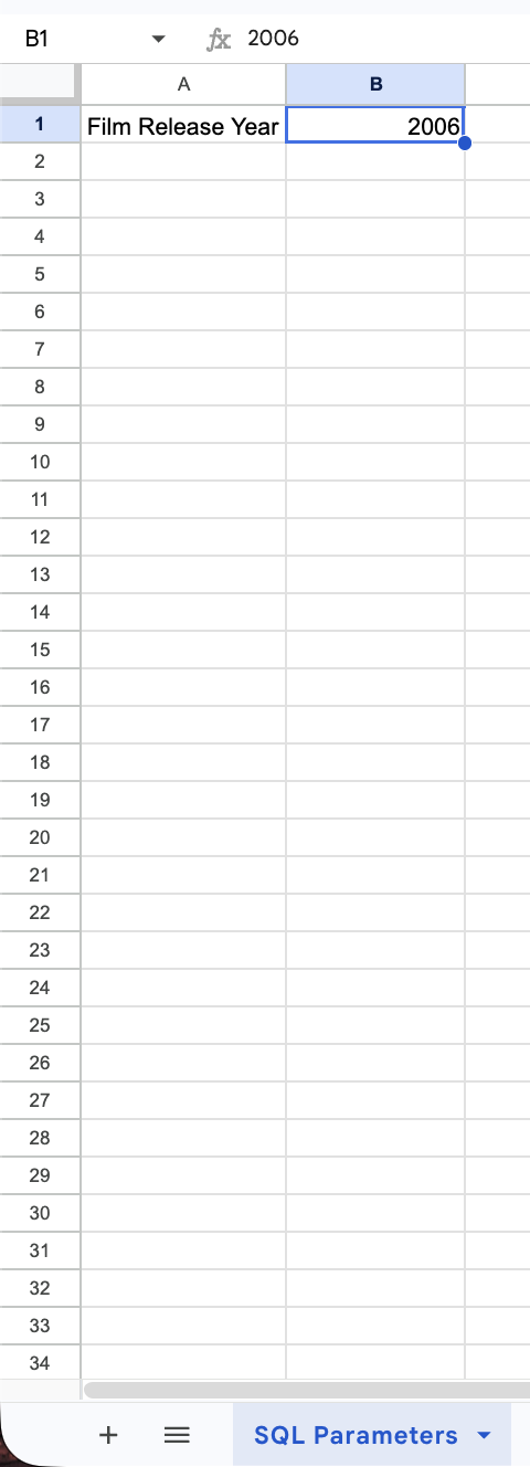 1. To set the SQL parameter, on a new sheet, go to cell “B1” and then enter “2006”. This value will be used in the film.release_year column.