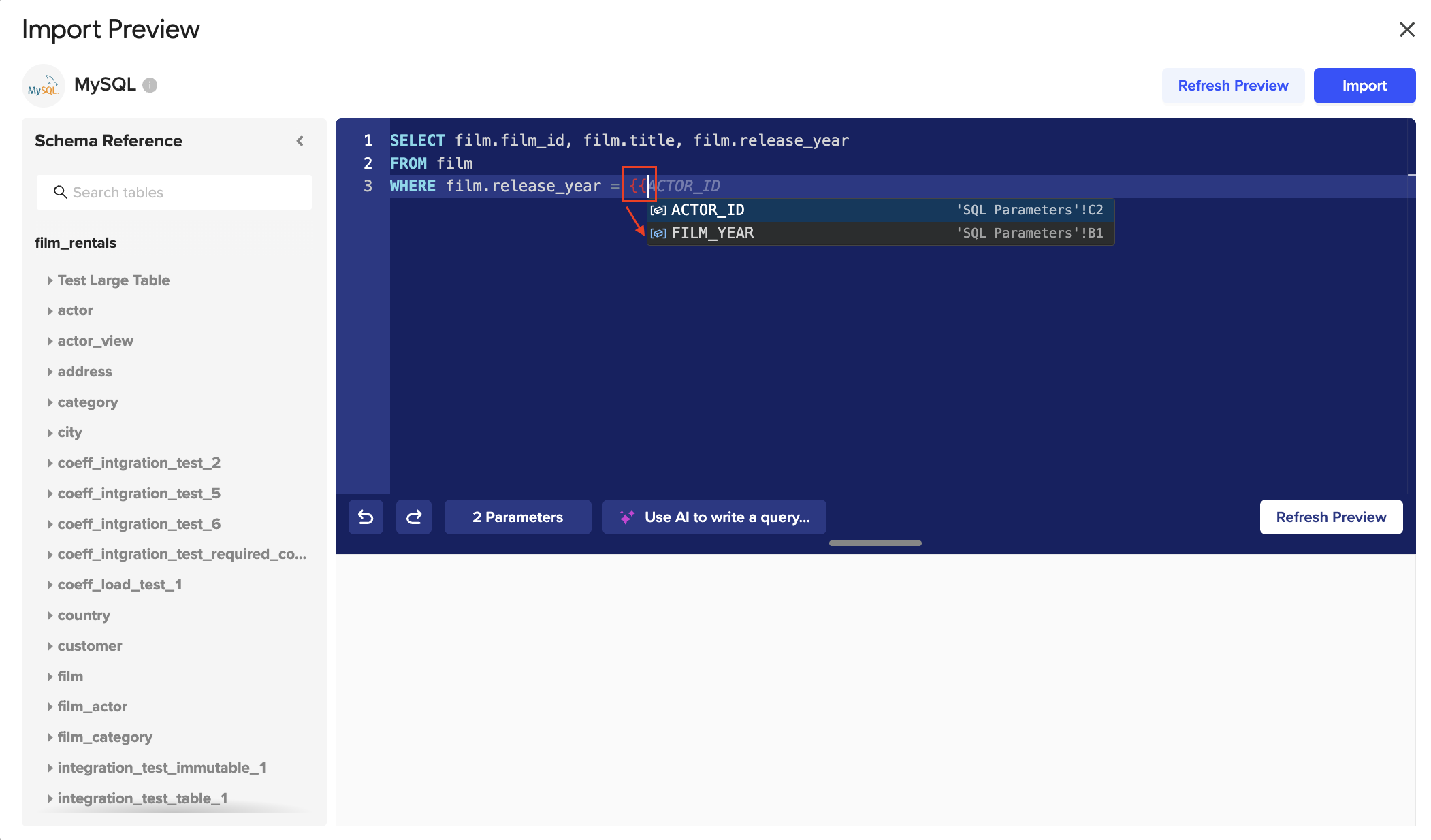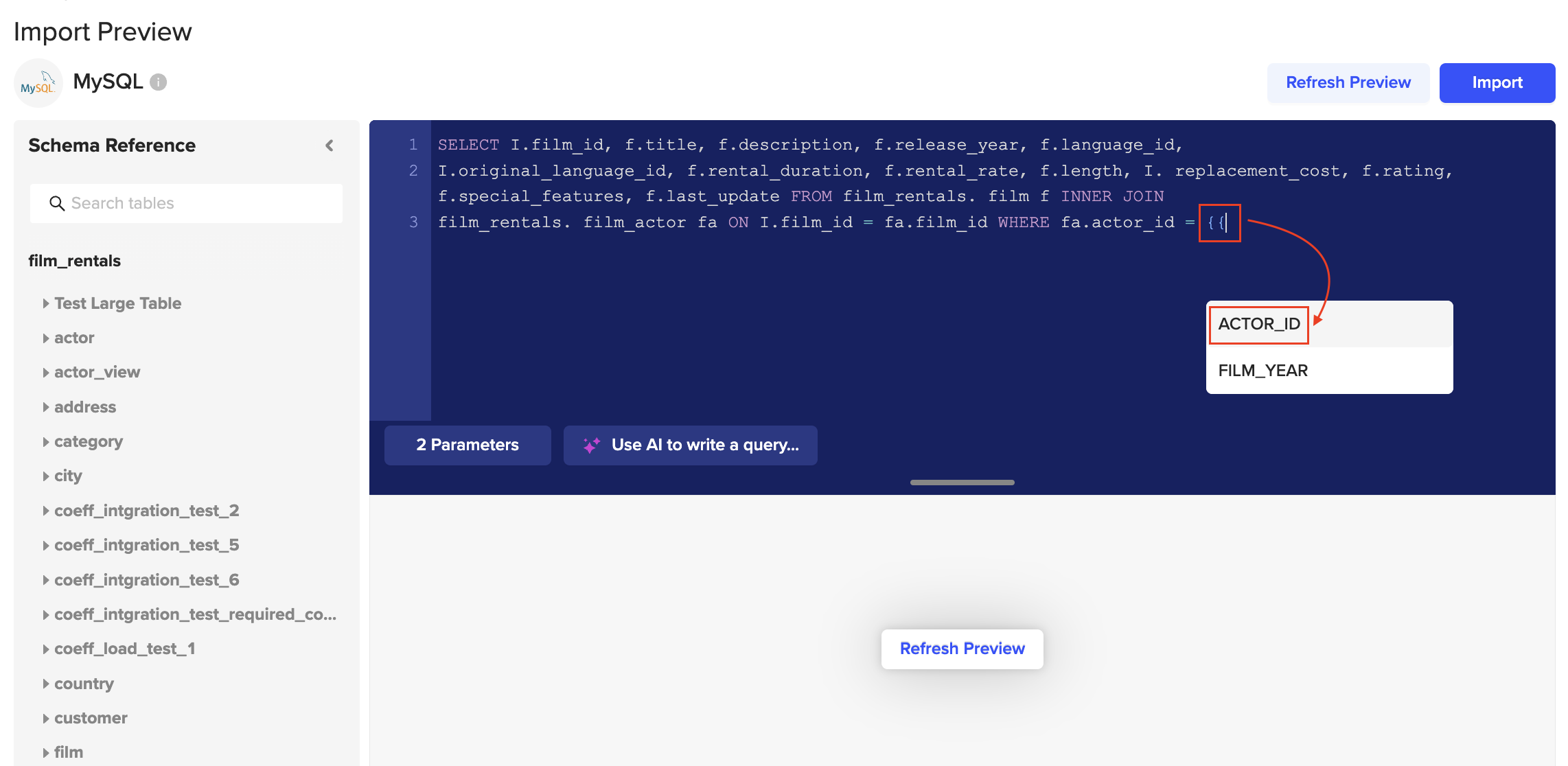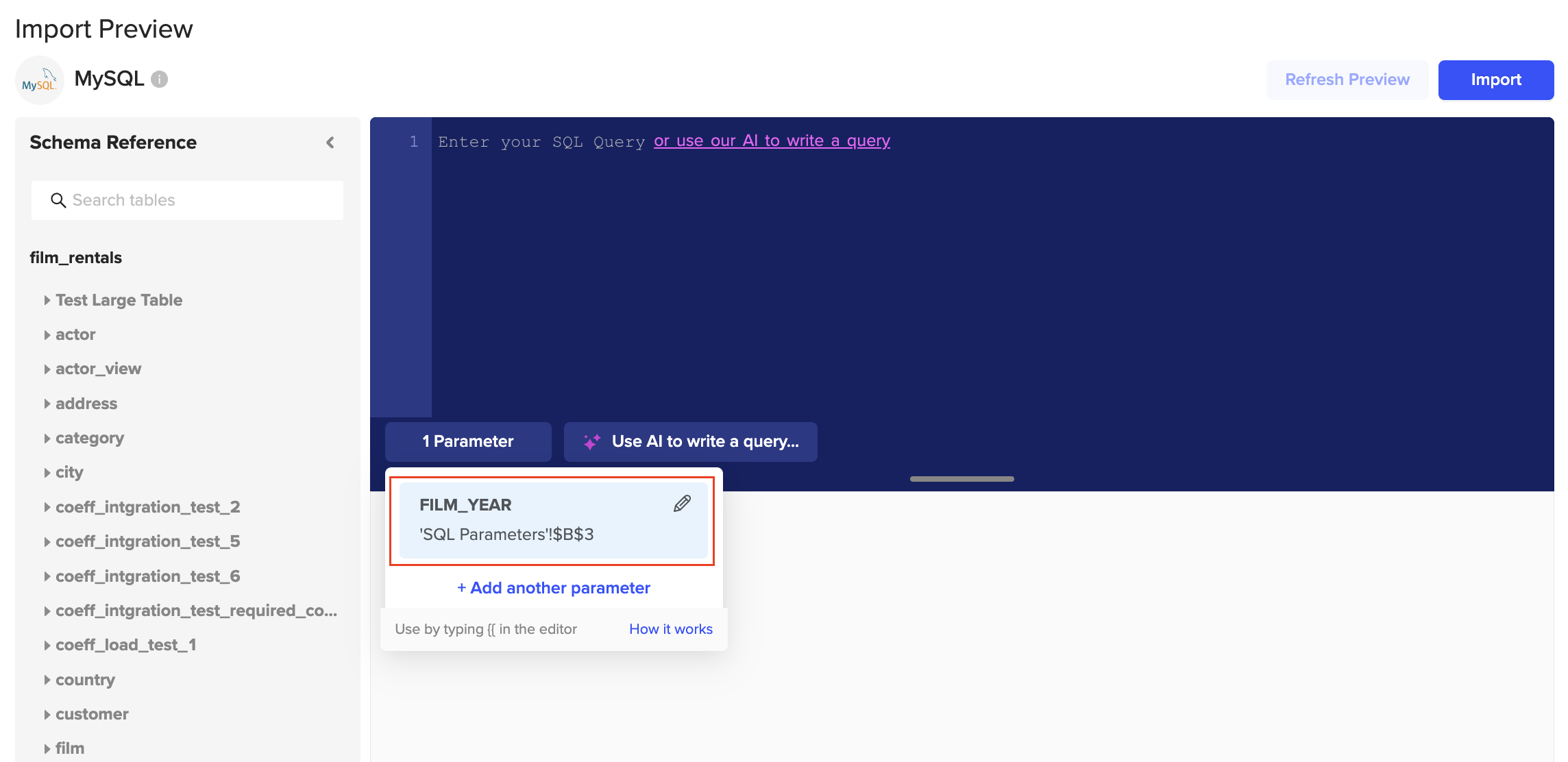 6. Add your query to this import. If you are using the parameter, you MUST include “{{” before and “}}” after for it to be valid. Click the “Refresh Preview” button to see how your data is shown.