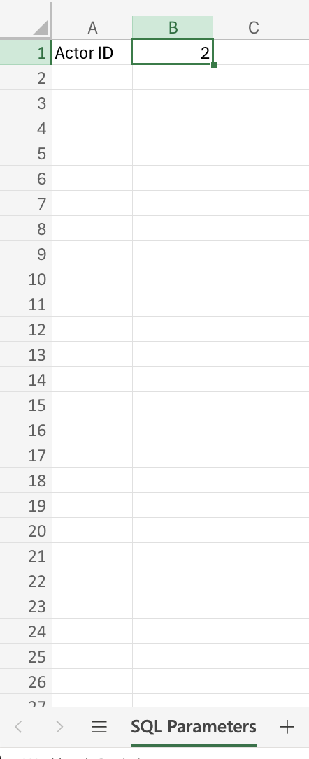 1. To set the SQL parameter, on a new tab/sheet, go to cell “B1” and then enter “2”. This value will be used in the film.actor_id column.