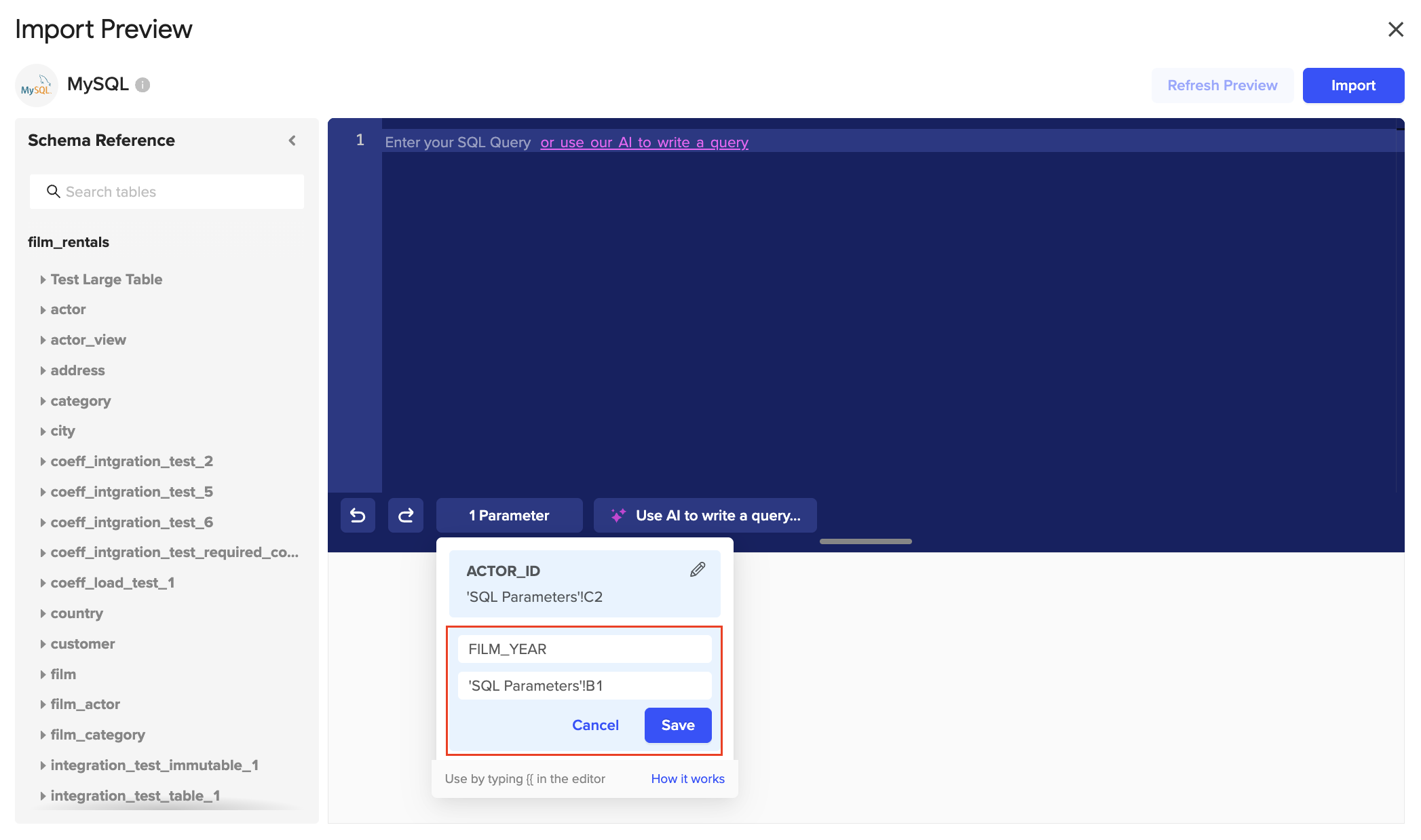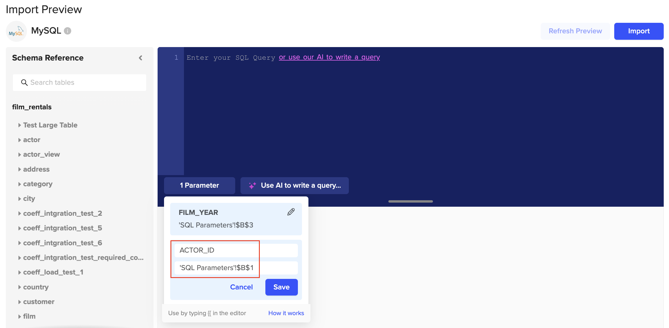 Example: Using MySQL, set up a SQL Parameter to dynamically set the “actor_id” column based on the value of B1 in another sheet.