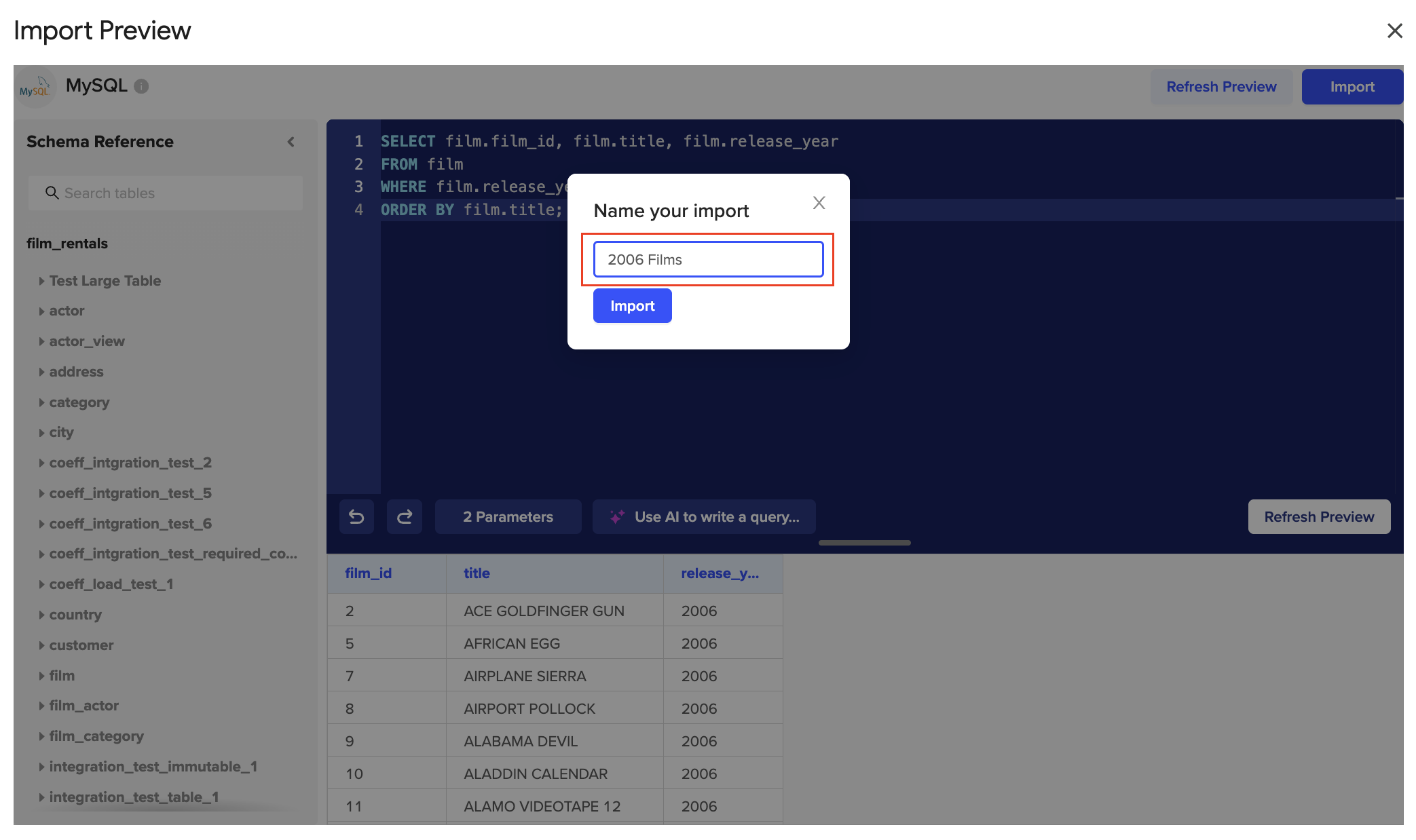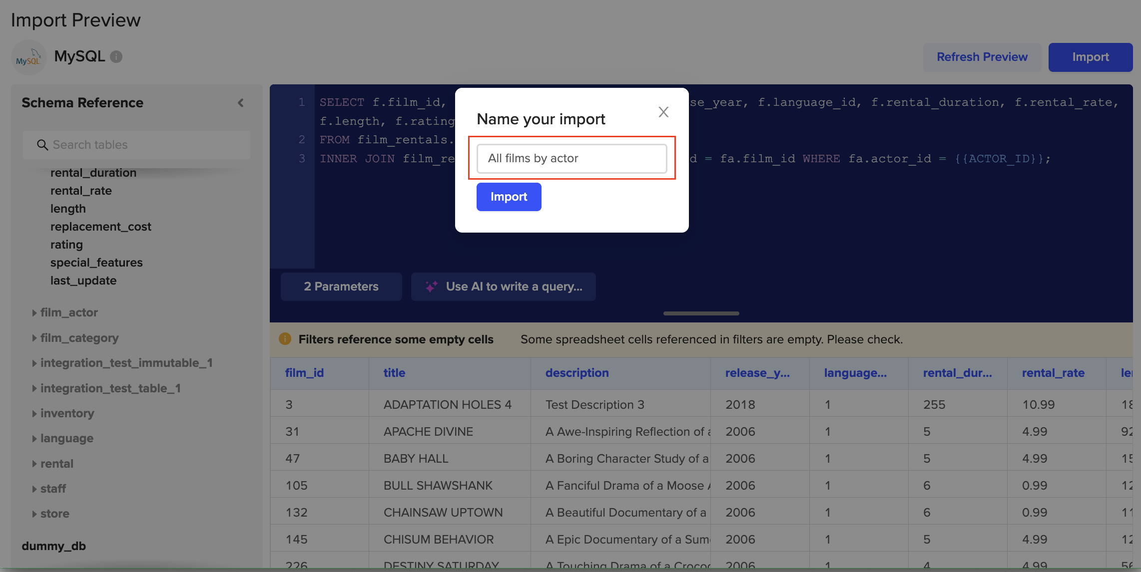 8. The import should now capture the value we entered in our parameter cell. Your import now shows all the films released in 2006. 🎉 🙌