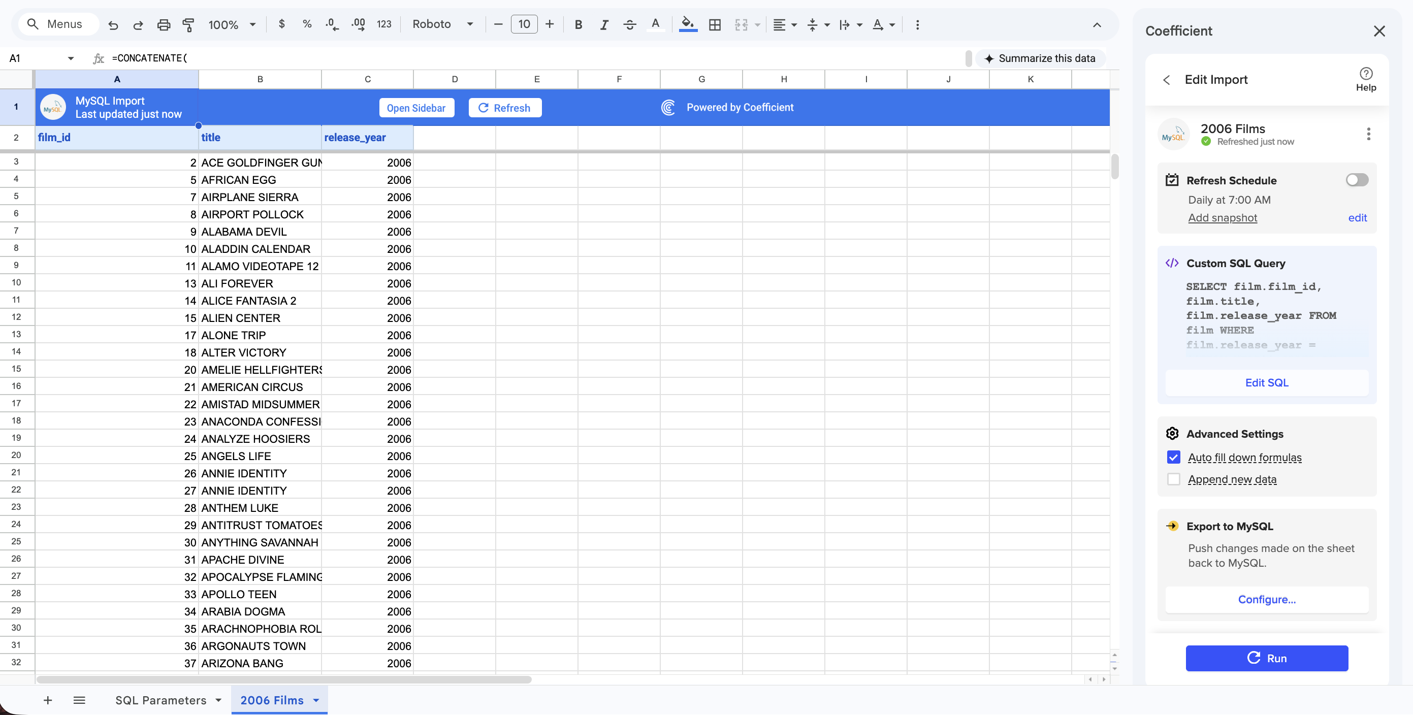 Example: Using MySQL, set up a SQL Parameter to dynamically set the value of the “film.release_year” column, based on the value of B1 in the sheet.