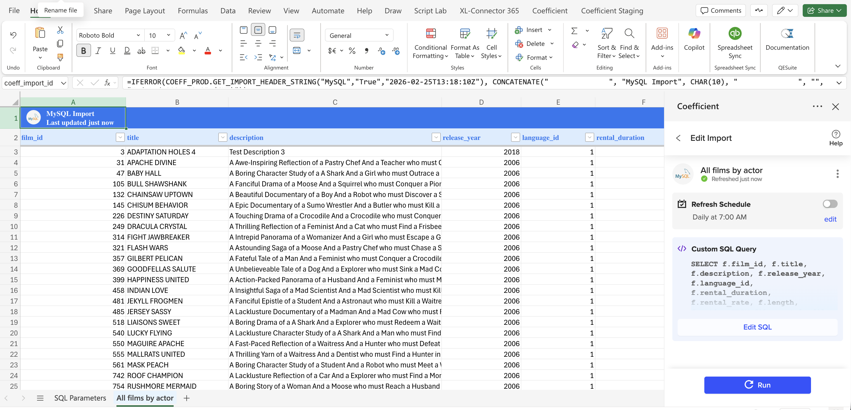 8. Coefficient now captures the value we entered on our parameter cell. Your import now shows all the films under Actor Id = 2. 🎉 🙌