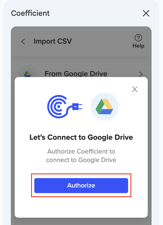 When you begin a CSV import for the first time, you will need to connect/authorize Coefficient to your Google Drive account successfully.