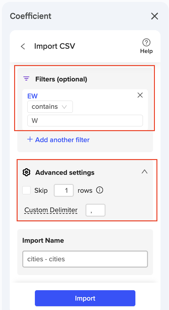 7. Customize with additional filtering and provide a name for the import. Advanced Settings: Skip: You may skip non-header rows to ensure the import starts on the first header row. Custom Delimiter: This can be used/modified based on the characters in the file. |