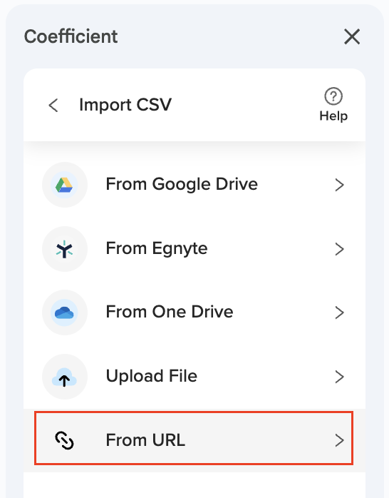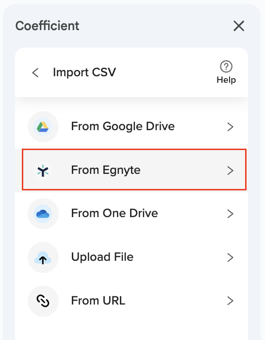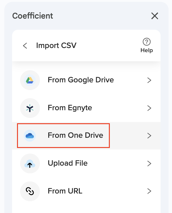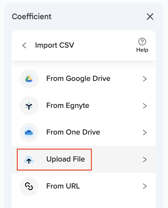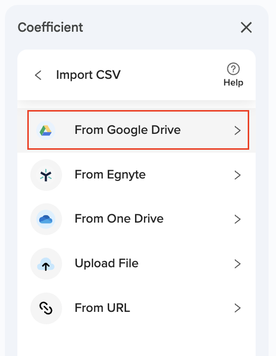 There are 5 different ways to import data using Coefficient’s CSV integration: Upload File, Pick from Google Drive, Egnyte, OneDrive, and Import from a URL.