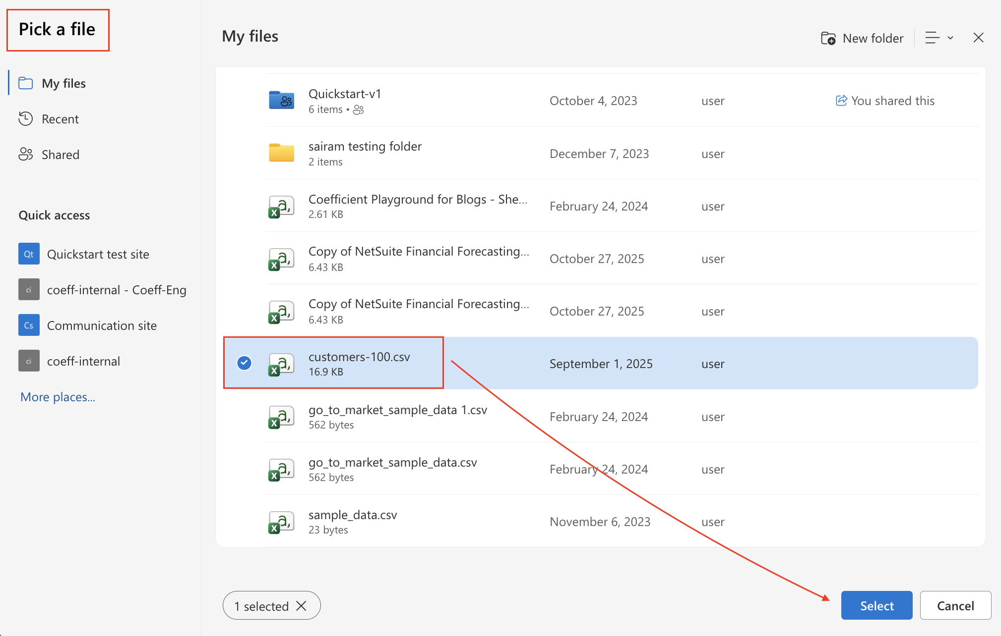 5. Select the CSV file you’d like to import into your spreadsheet or workbook. Depending on where the file is stored in your OneDrive instance, you may need to navigate through multiple folders to locate it. Once you’ve highlighted the file, click Select to continue with the import.