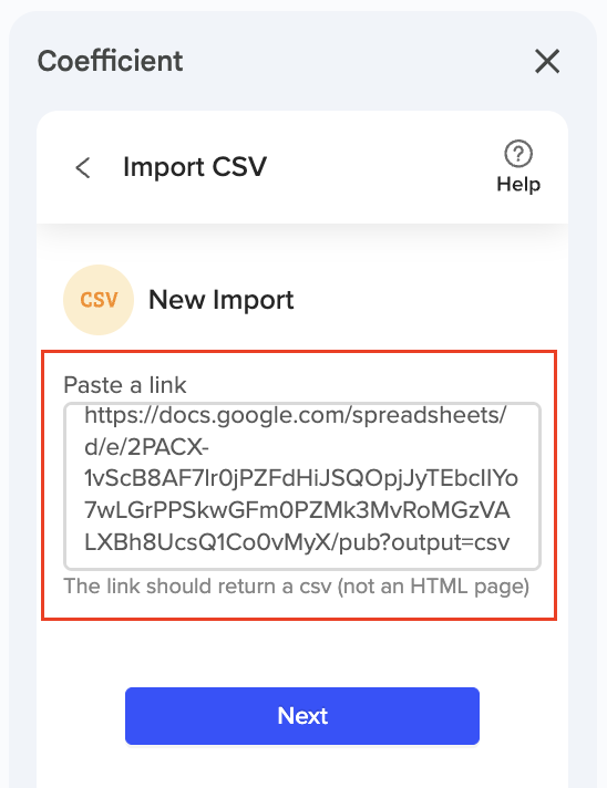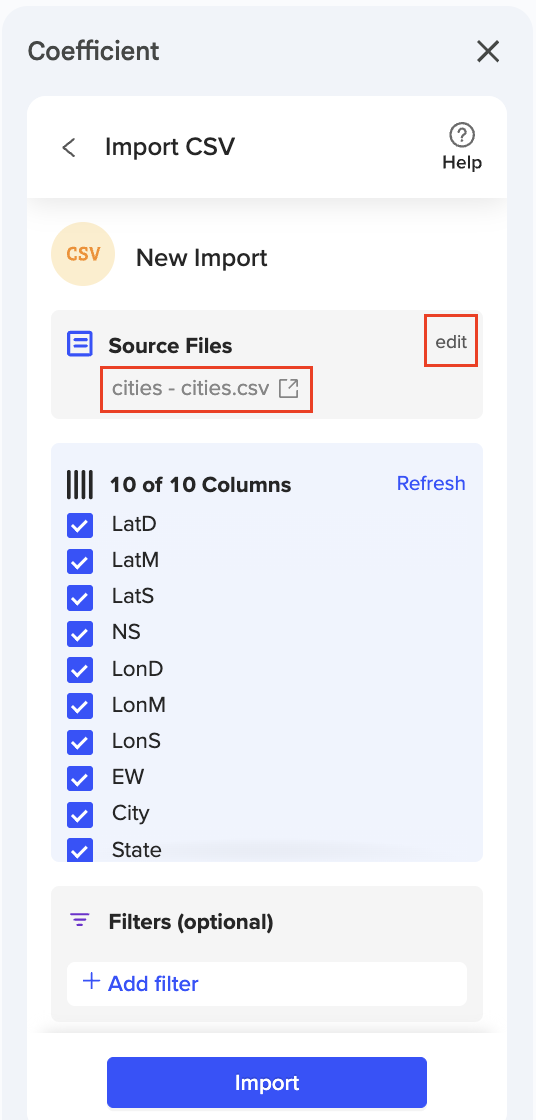 ℹ️ NOTE: If you add a new CSV file to Drive with the same (exact) name as the source file, Coefficient will pick up the updated file when the import is refreshed.