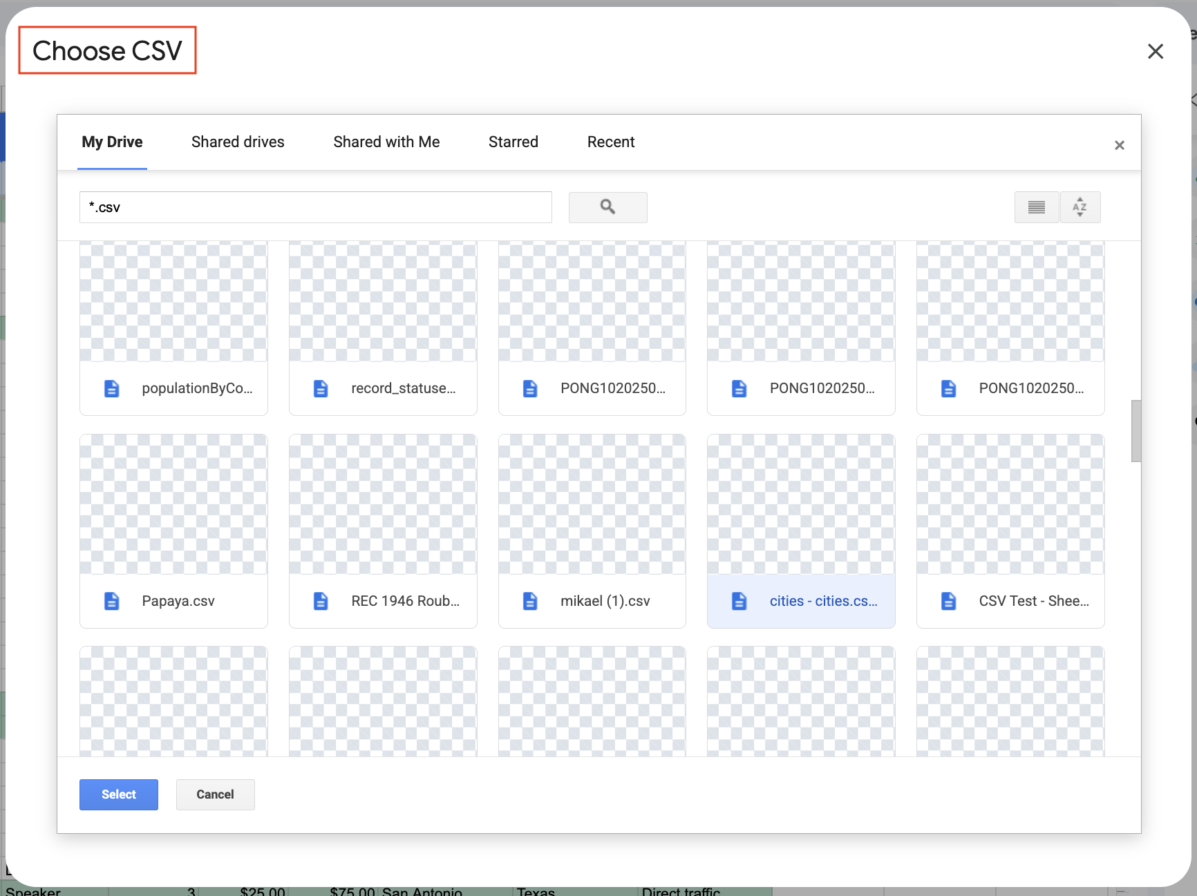 5. A window will appear, allowing you to select a file from one of your Drive folders.