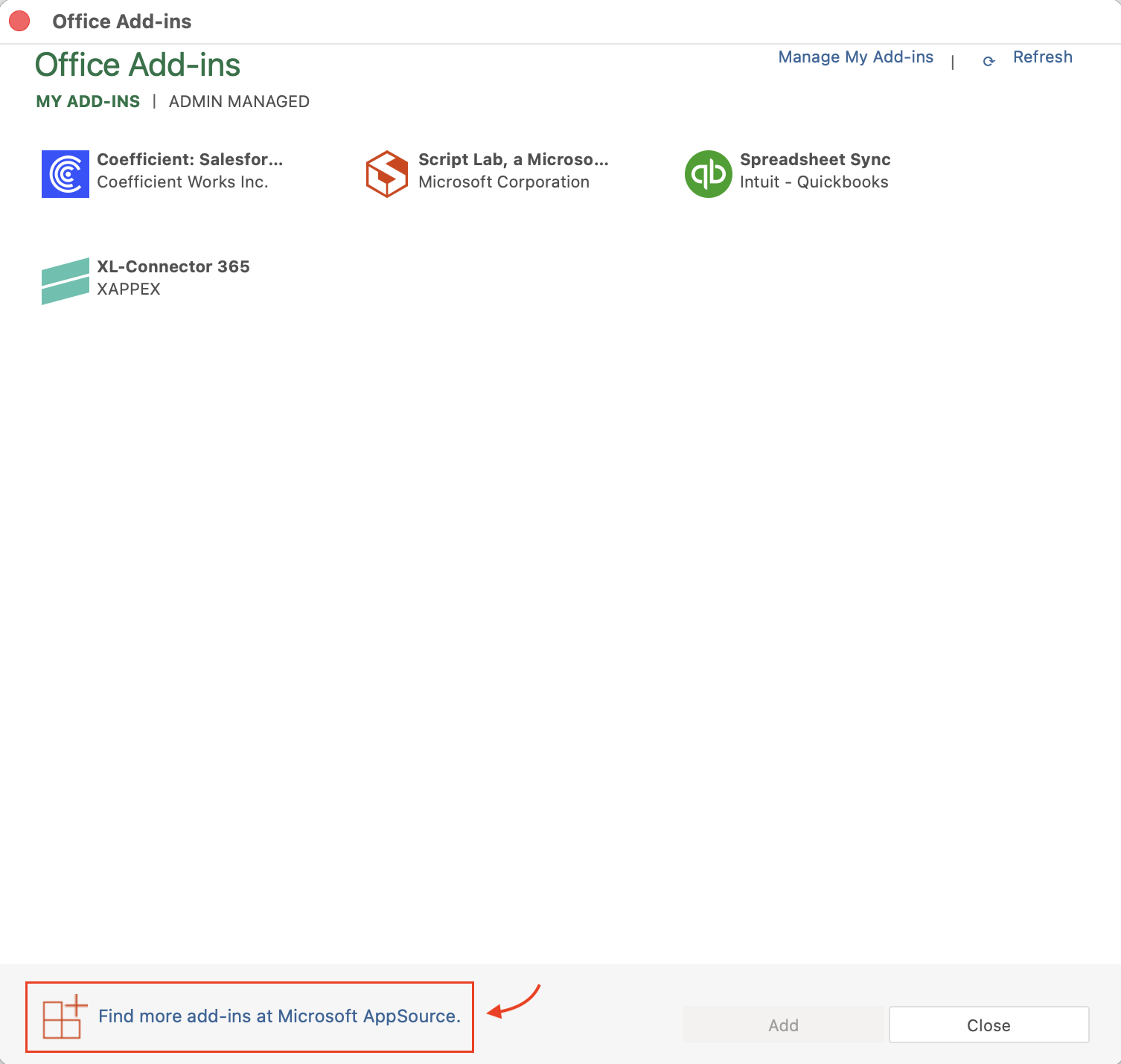 2. Click the "Find more add-ins at Microsoft AppSource" link at the bottom.