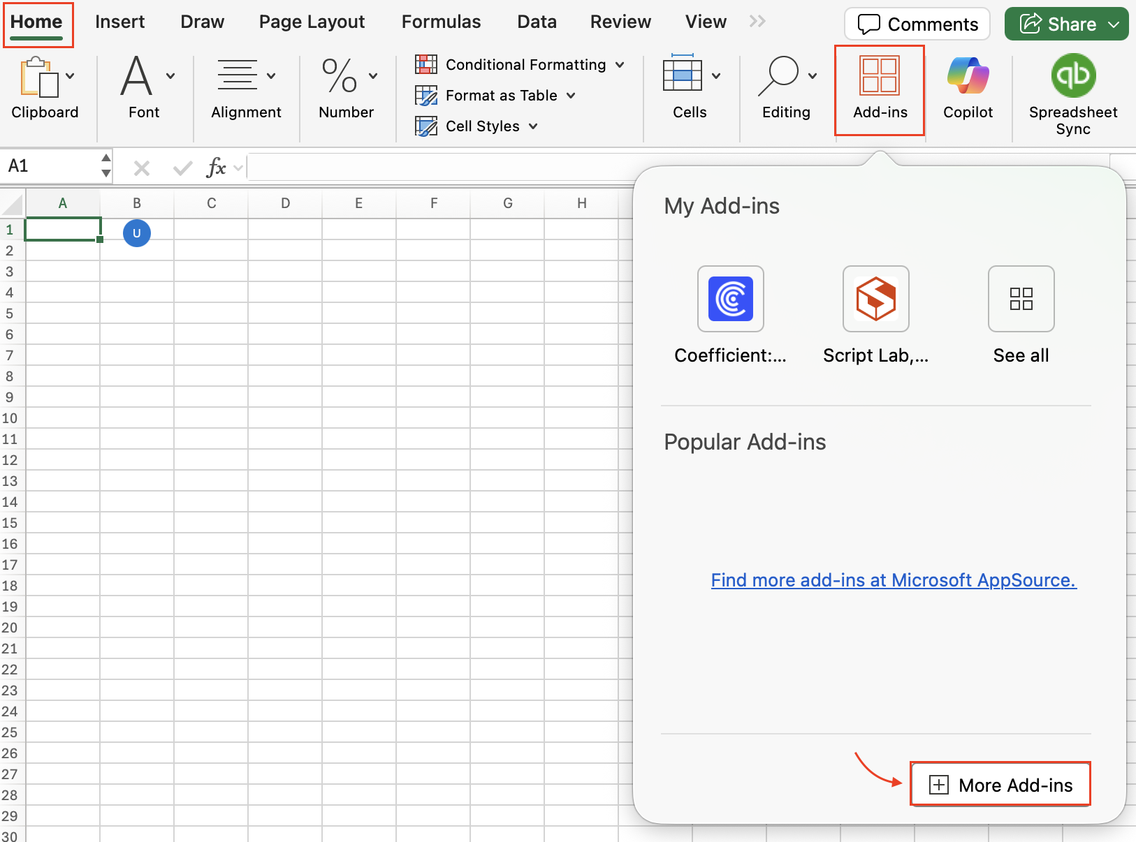 1. On a new Excel for Desktop spreadsheet, click “Home” and select "Add-ins”.
