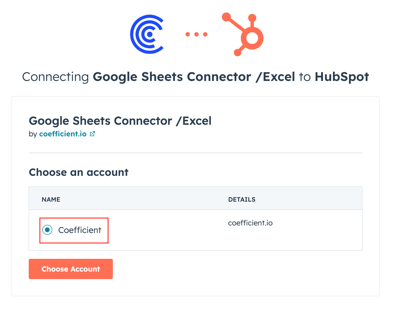6. You will be taken to a new screen to login to your HubSpot account. After your login, you can choose your HubSpot account. It will authenticate and connect HubSpot as a data source for Coefficient. You can now start creating Coefficient imports from HubSpot. 😎