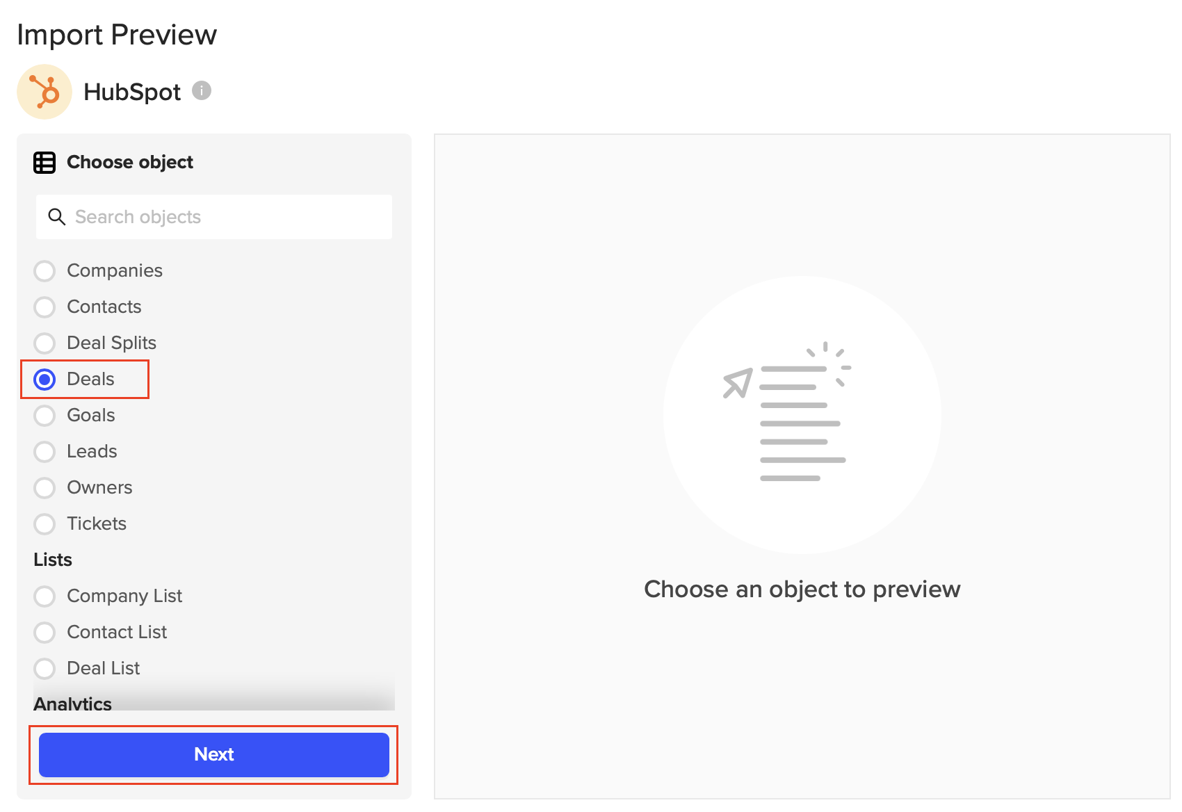 5. Select or search for the HubSpot object you would like to import your data from (Deals), then hit "Next".