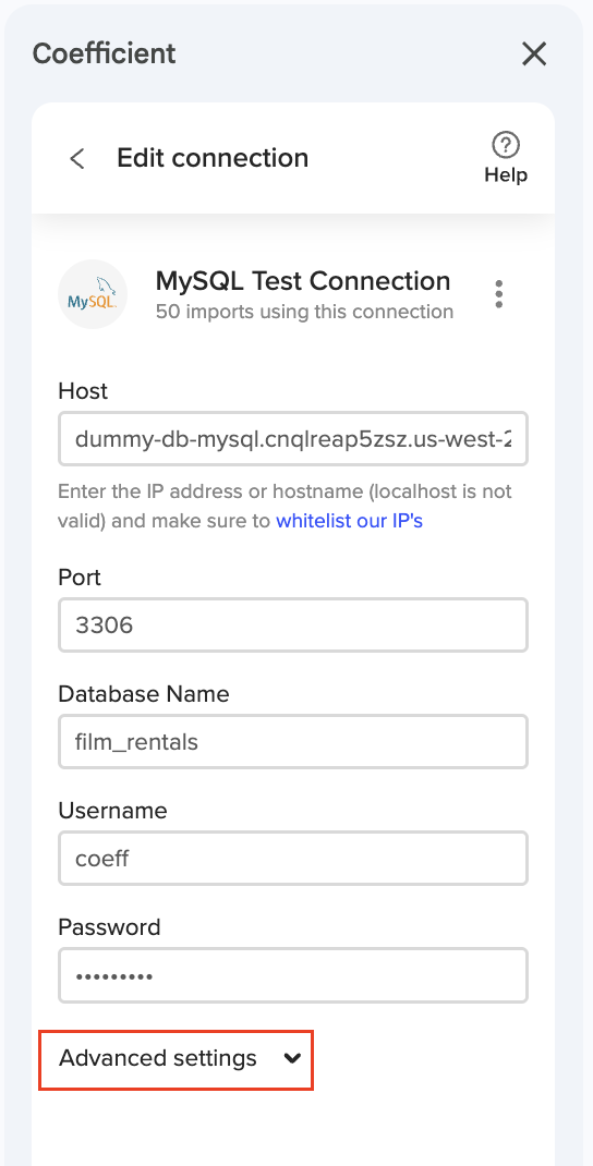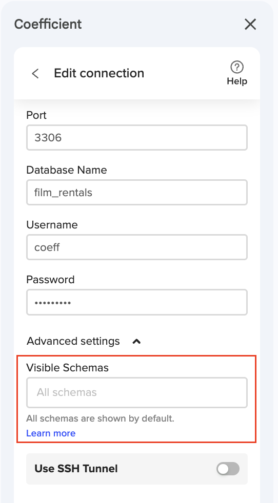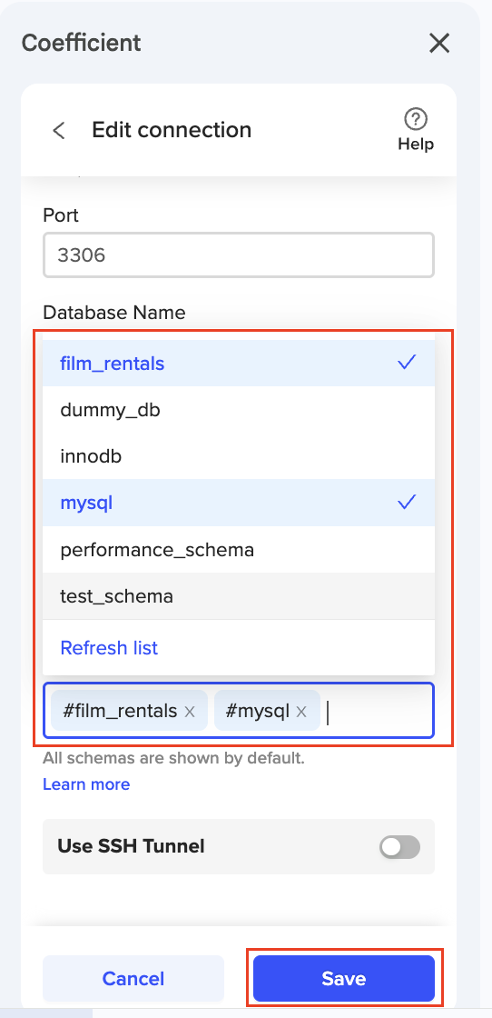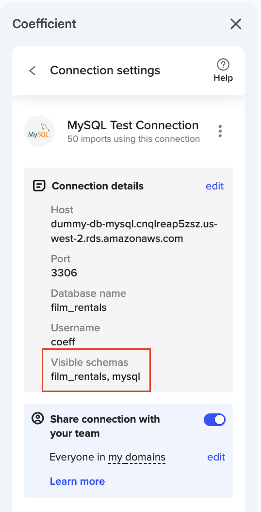 ℹ️ NOTE: The Coefficient Schema Limit feature is available for integrations using SQL connectors, including Postgres, MySQL, MS SQL, Snowflake, Redshift, BigQuery, and Databricks.