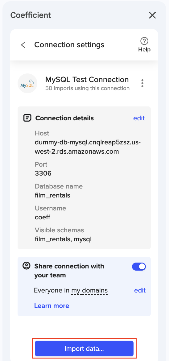 If you know the schema name, you can manually enter it in the Custom SQL query section to run your query. Additionally, when using a custom SQL query to create an import, you can query any database objects (tables, views, etc.) permitted by the connection’s SQL permissions—even if the schemas are hidden using Coefficient’s schema hiding feature.