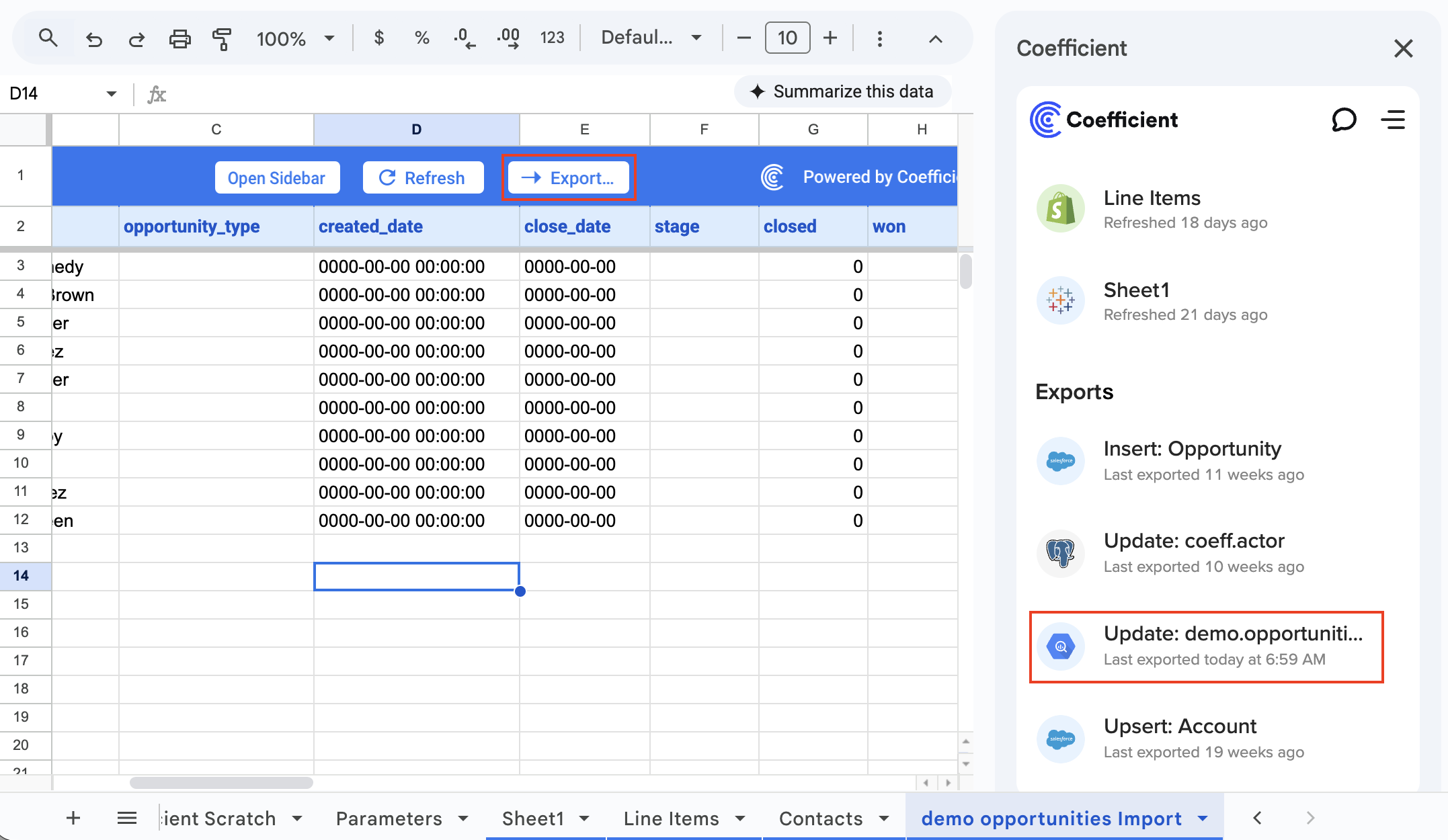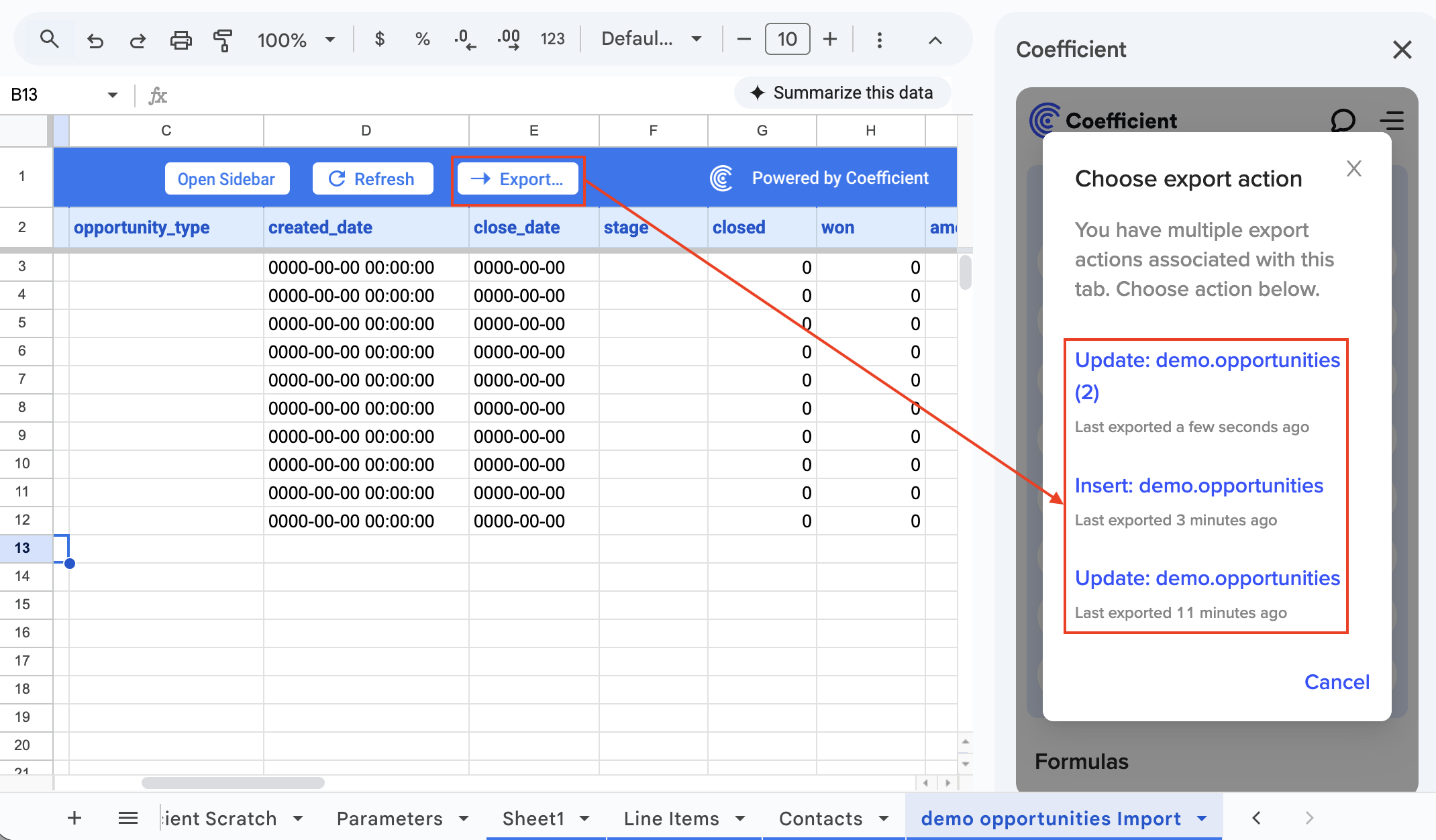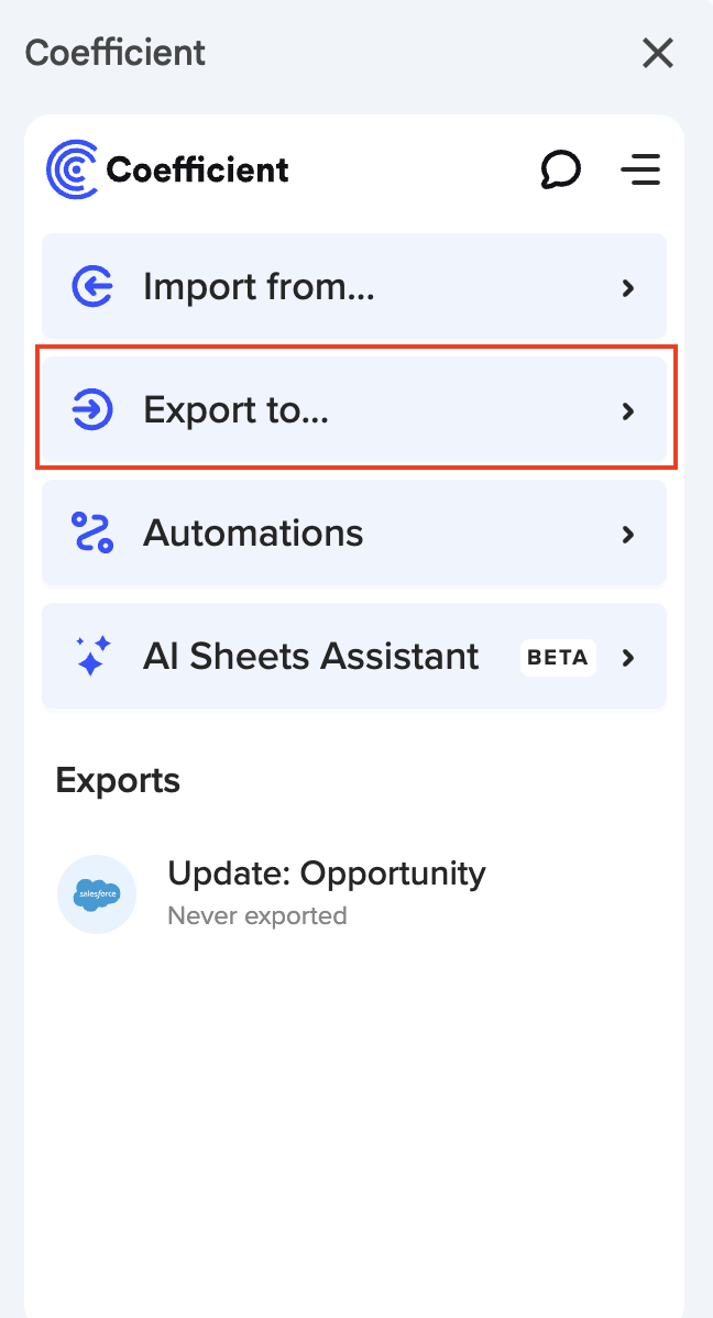 Include export button on sheet: Coefficient adds an "Export" button on your sheet to quickly access your export configuration in the sidebar. This works if your data is generated from a Coefficient import. |