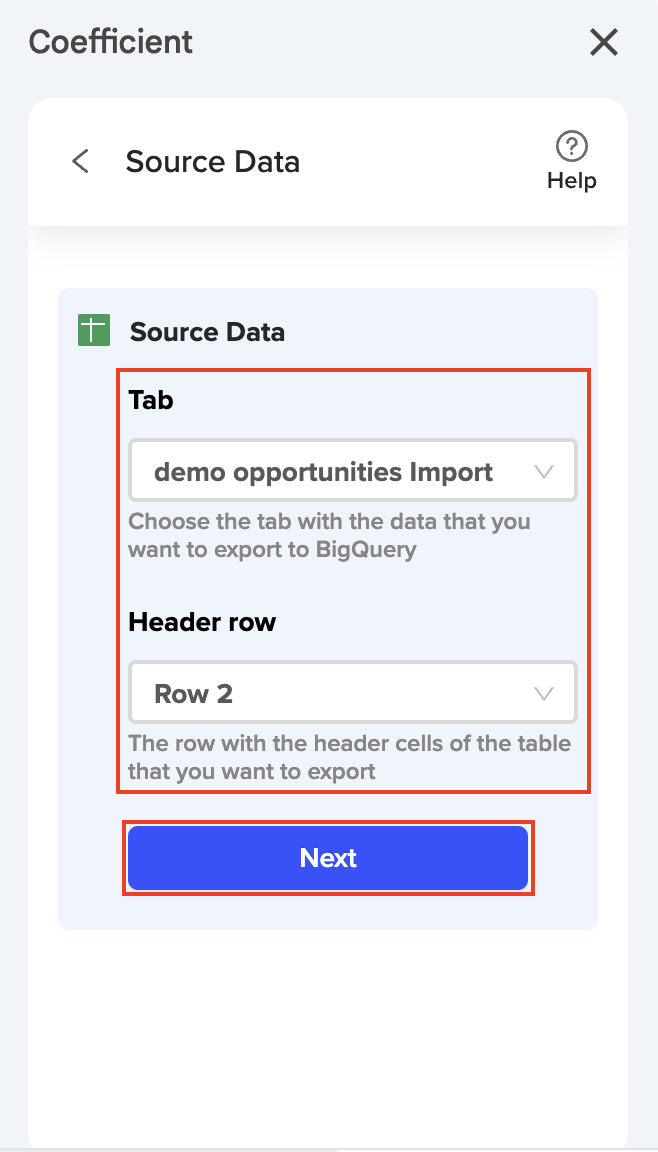 3. Select the Tab and Header row (the Header row is not the Coefficient header, but the row with the BigQUery field headers), then hit "Next." |