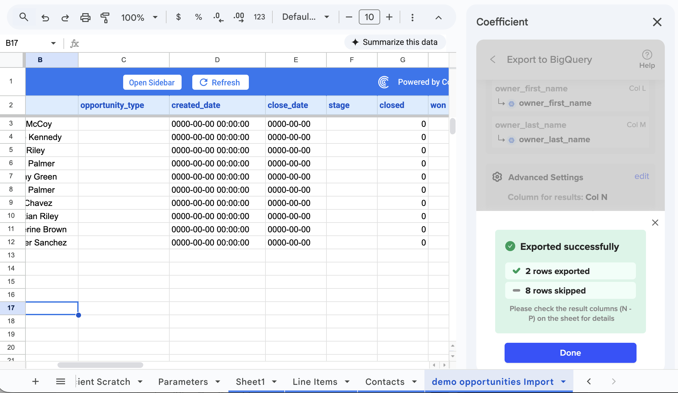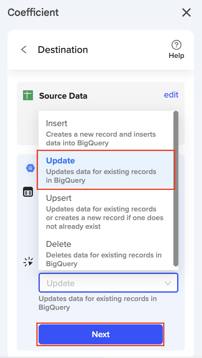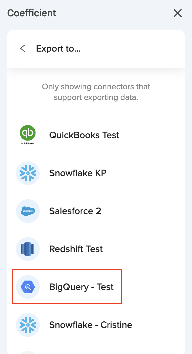 Export to BigQuery is a very powerful tool in Coefficient. This feature allows you to update data from Google Sheets/Excel and then uses Coefficient to push (or write back) those updated data directly into your BigQuery instance.