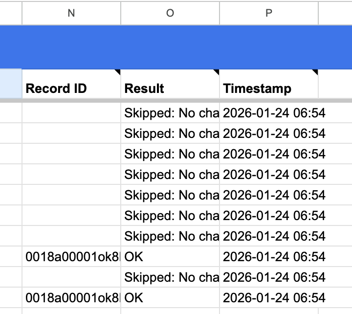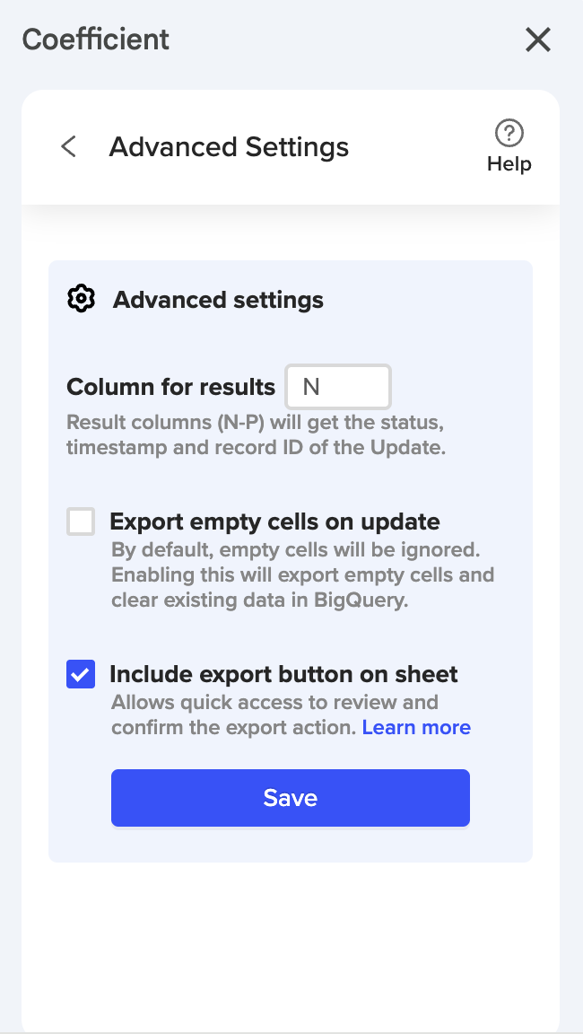 6. Advanced Settings: Column for Results: Each time you Export to BigQuery, Coefficient will write information back to your sheet related to that update. Coefficient will try to guess what the first empty column is in your sheet and suggest that as the column to use to populate this information. We will write 3 columns to the sheet, (1) the Record ID (2) Result (OK, ERROR, etc.), and (3) the date/time stamp that the record was updated last using Coefficient.