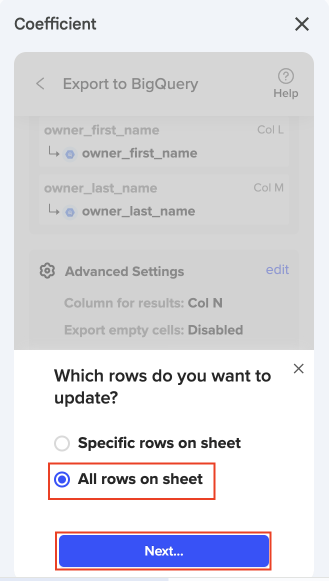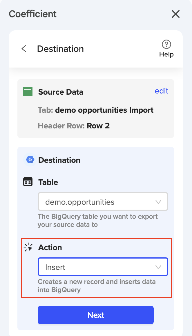 ℹ️ NOTE: We recommend creating a BigQuery import of your data into Google Sheets/Excel using Coefficient before performing the Export to BigQuery. This allows us to detect/map certain fields automatically. (This is not required but HIGHLY recommended.)