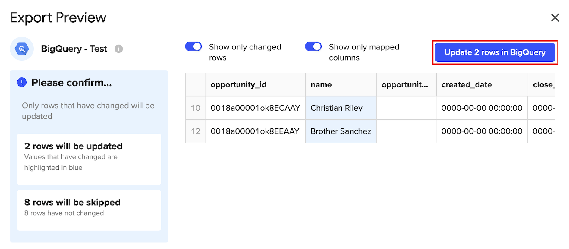 ℹ️ NOTE: Toggle the buttons at the top (enabled by default) to either "Show only the changed rows" or "Show only the mapped columns" for better visibility.