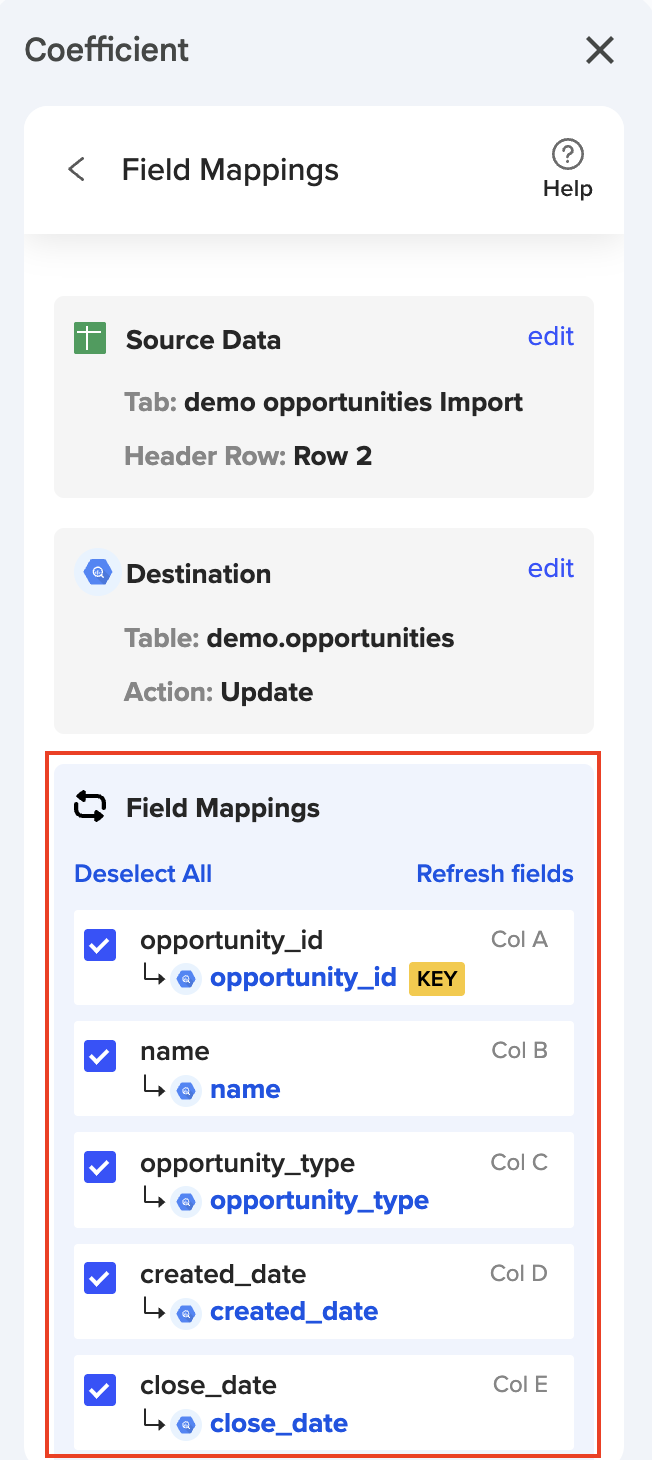 1. Export to BigQuery a second time will reveal the “Export” button in the Coefficient Header and the previous mappings in the sidebar.