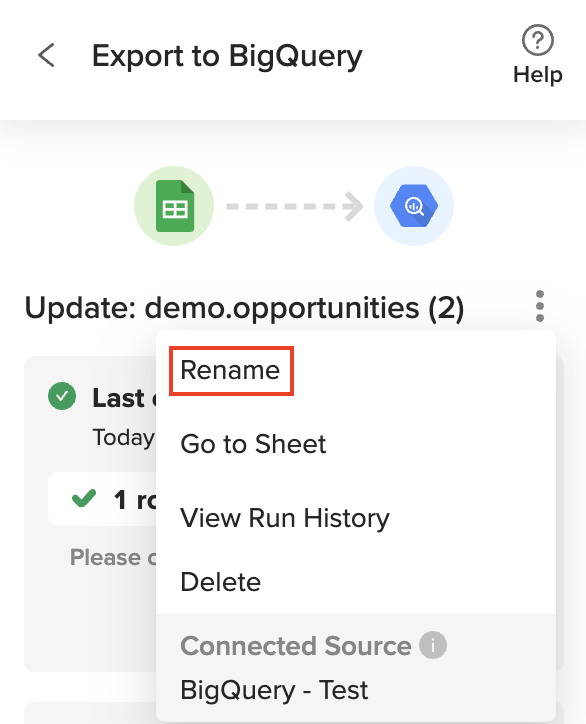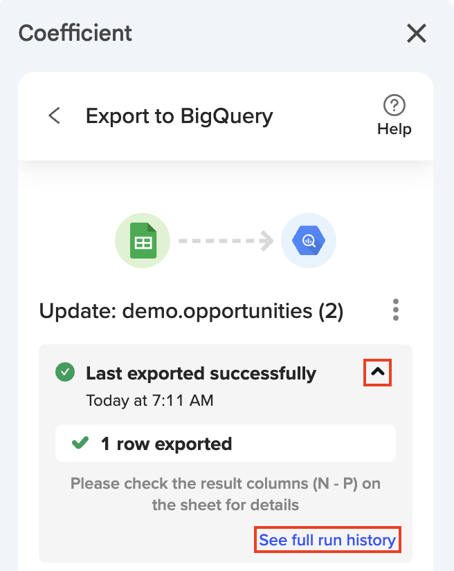 Make sure to review the mappings before performing the Export to BigQuery again. (From here, you can view the run history and settings) then proceed with the typical “Export to…” process.