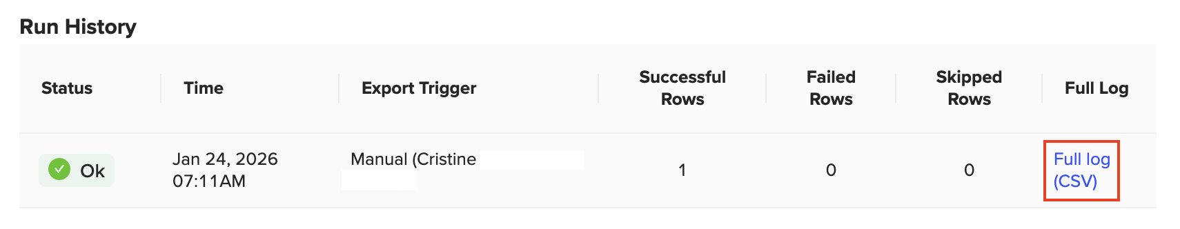 In the Coefficient sidebar, you will see all of your imports, and if you scroll down, you will see a section called “Export". Locate the Export you would like to see the Run History for and click on it to open up the details. You should see a “See Full Run History” link when you collapse the last export information.