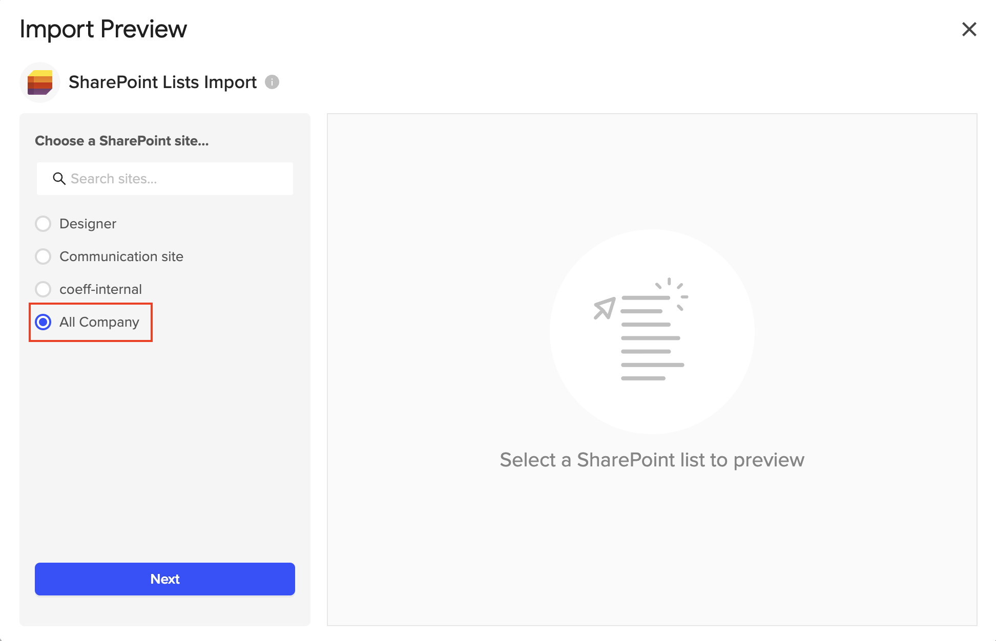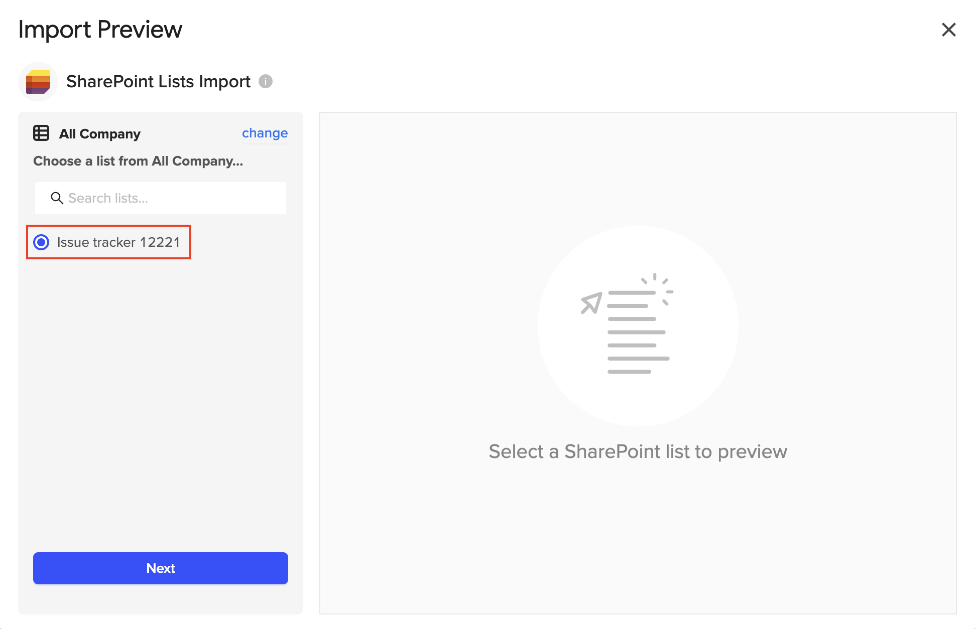 4. The Import Preview window will open, showing a list of all SharePoint sites accessible to your account. Select one you'd like to import from. (e.g., All company).5. Choose the list you'd like to import. (e.g., Issue tracker 12221).
