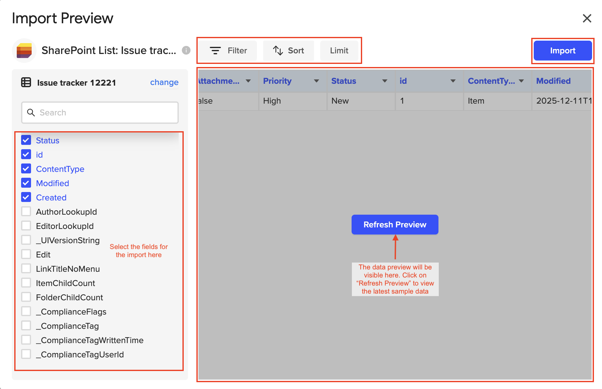 âšď¸ NOTE: To view the latest data after making modifications, select the "Refresh Preview" button.7. Congratulations on creating your first import from SharePoint Lists! đ