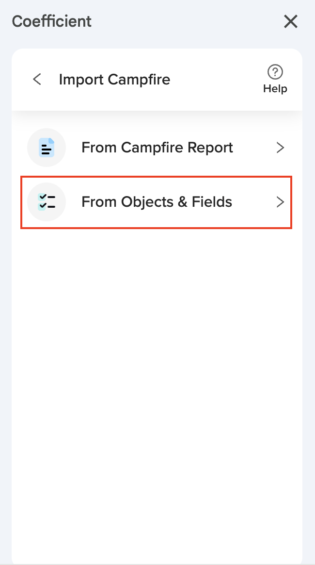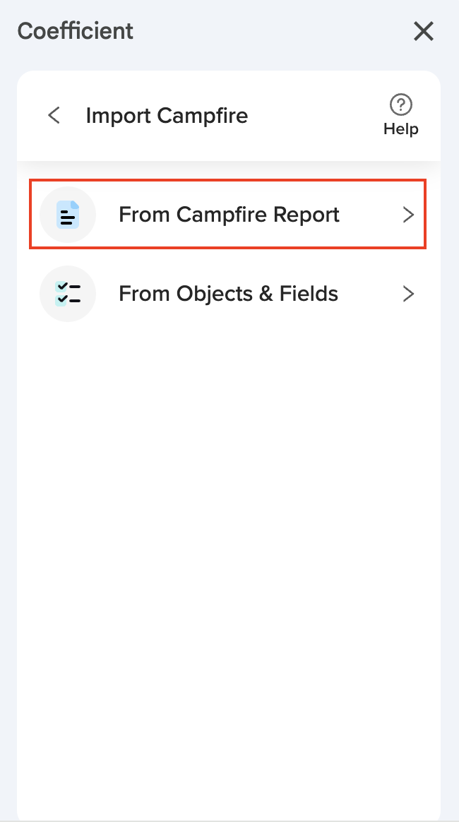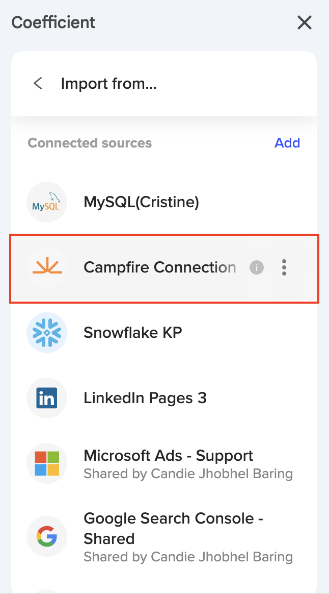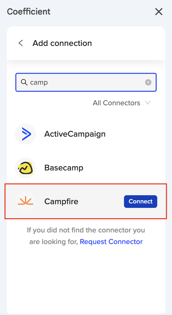 When you begin a Campfire import for the first time, you will need to go through a few steps to connect to Campfire as a data source for Coefficient.
